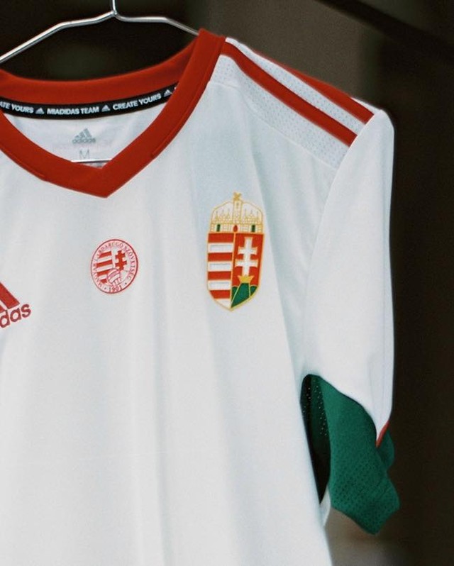 Hungary’s white change design features the other tones of the national flag - green and red - as trim with red providing the fill for all the adidas branding and the simple “V”-style neck.