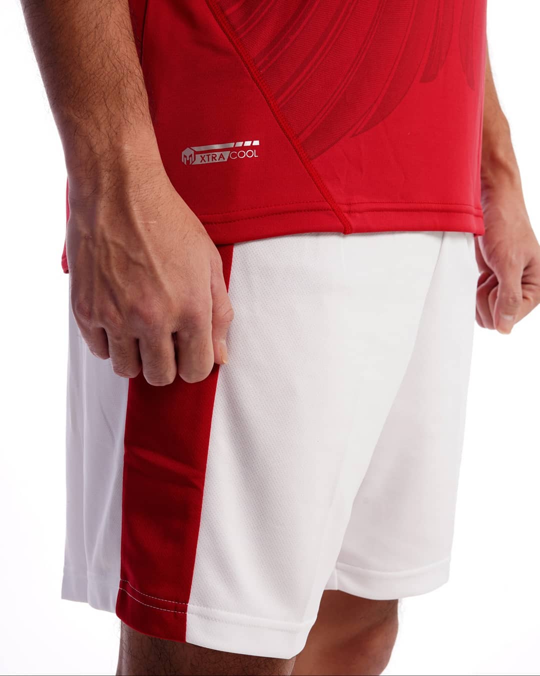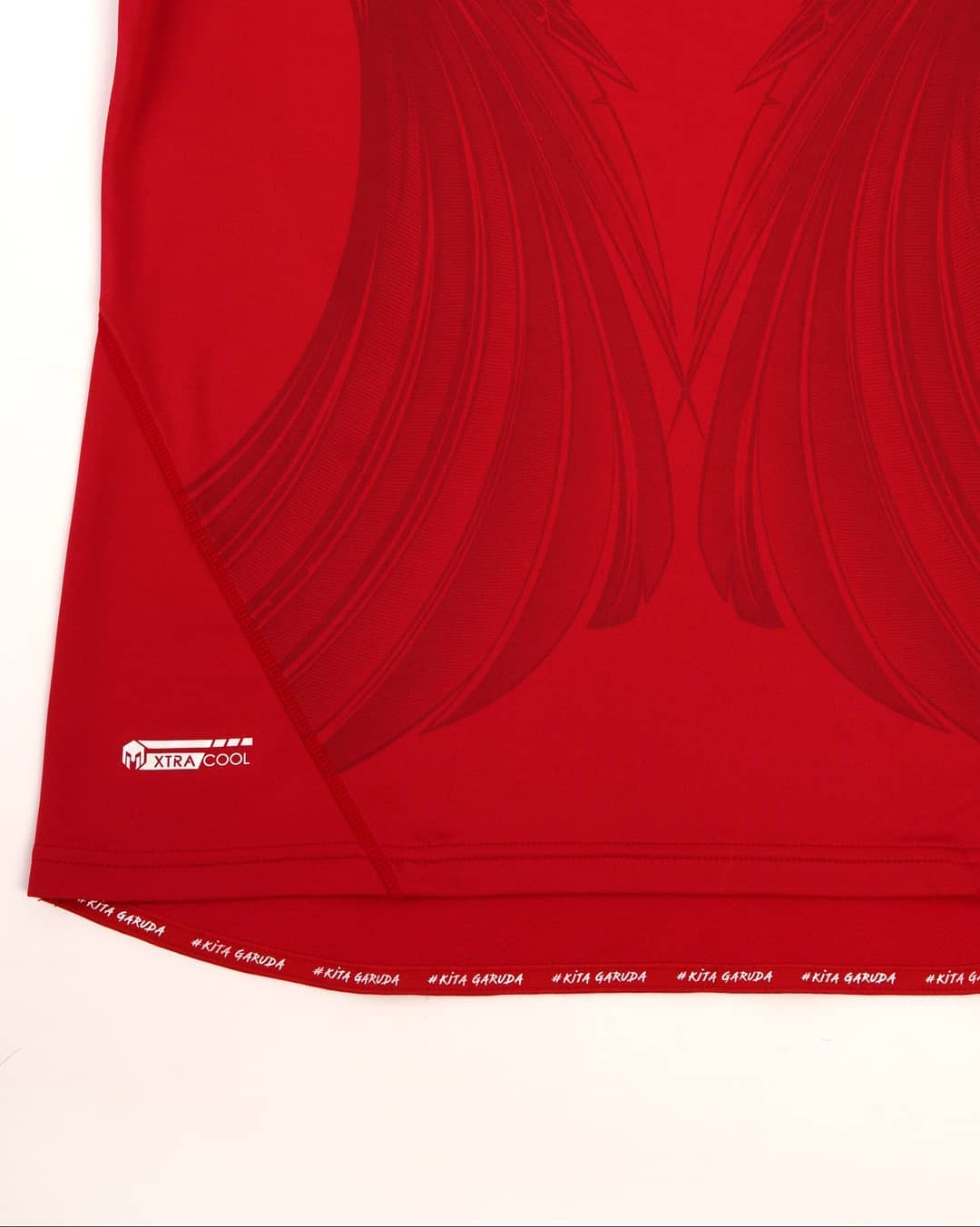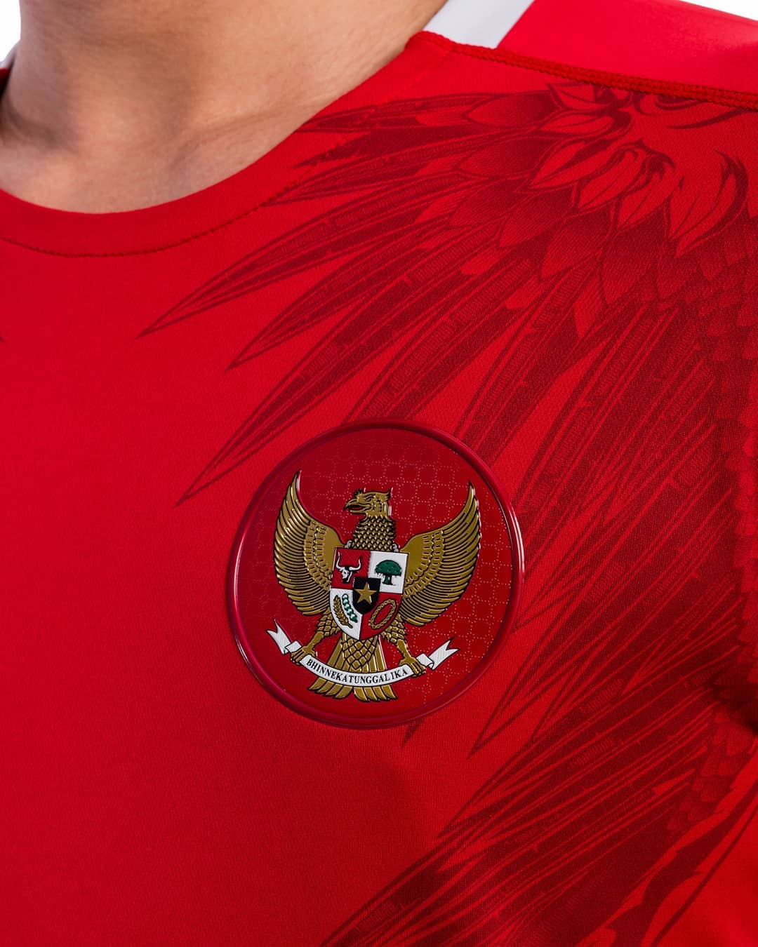 The torso of the shirt displays sublimated stylised wings, as a nod to the Garuda bird on the textured crest, and white trim on the neck and red socks tie in with the red-trimmed white shorts.
