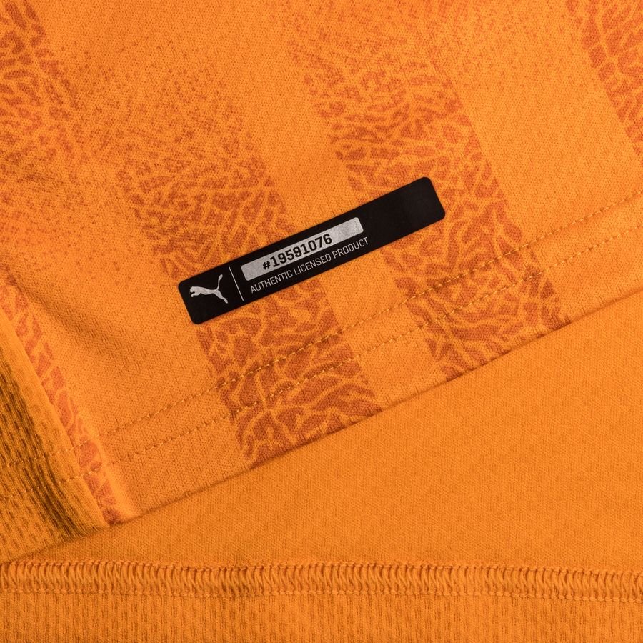 Puma’s recently employed stylised shoulder stripe is in green - carrying orange Puma logos - as is the neat collar, while the national team’s crest is in full colour and Puma’s chest logo is also in green.