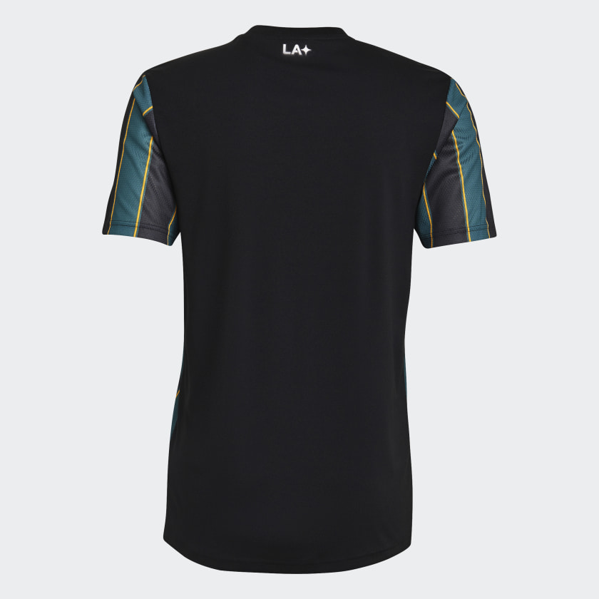 The new adidas LA Galaxy Community Kit was born from the club's culture and features a vertical stripe design in black, tech green, and team collegiate gold that pays homage to the club's history.
