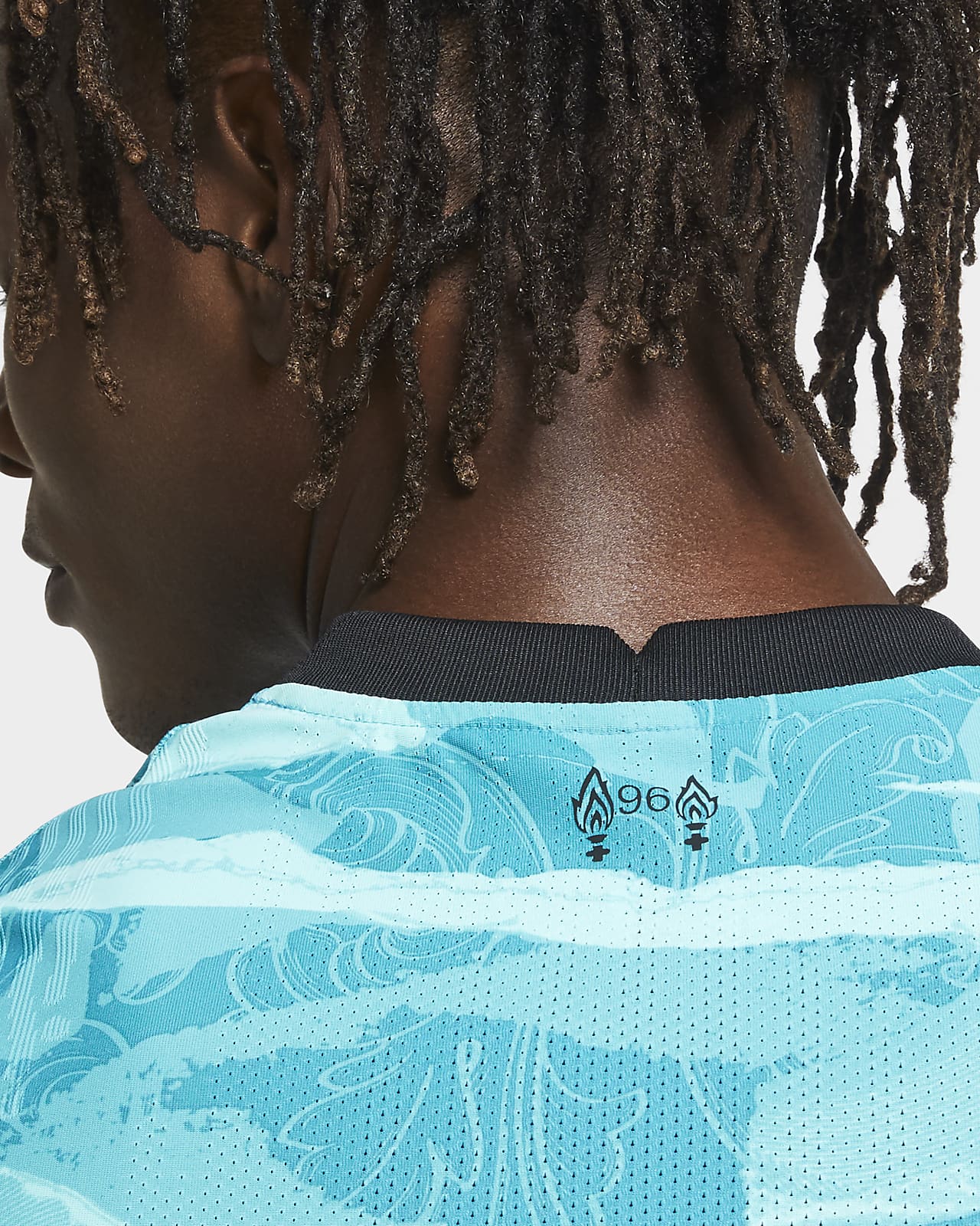 Having introduced teal through subtle design references in the home jersey, the colour explodes into a bold print on the 2020-21 away jersey — heavily influenced by the Liver Bird (the beacon of the city). The kit is also emphasized by the Shankly gates, which are brought to life through the swirling acanthus leaves that embellish the legendary You’ll Never Walk Alone motif.