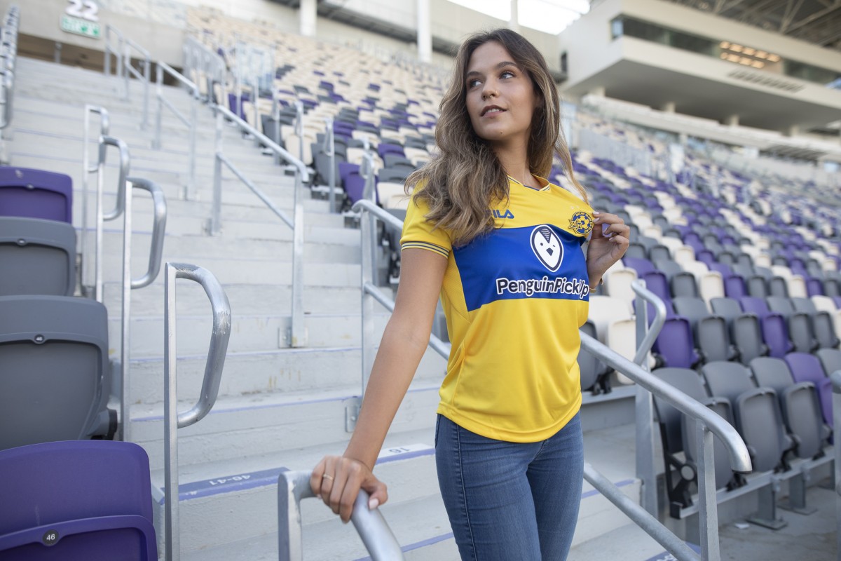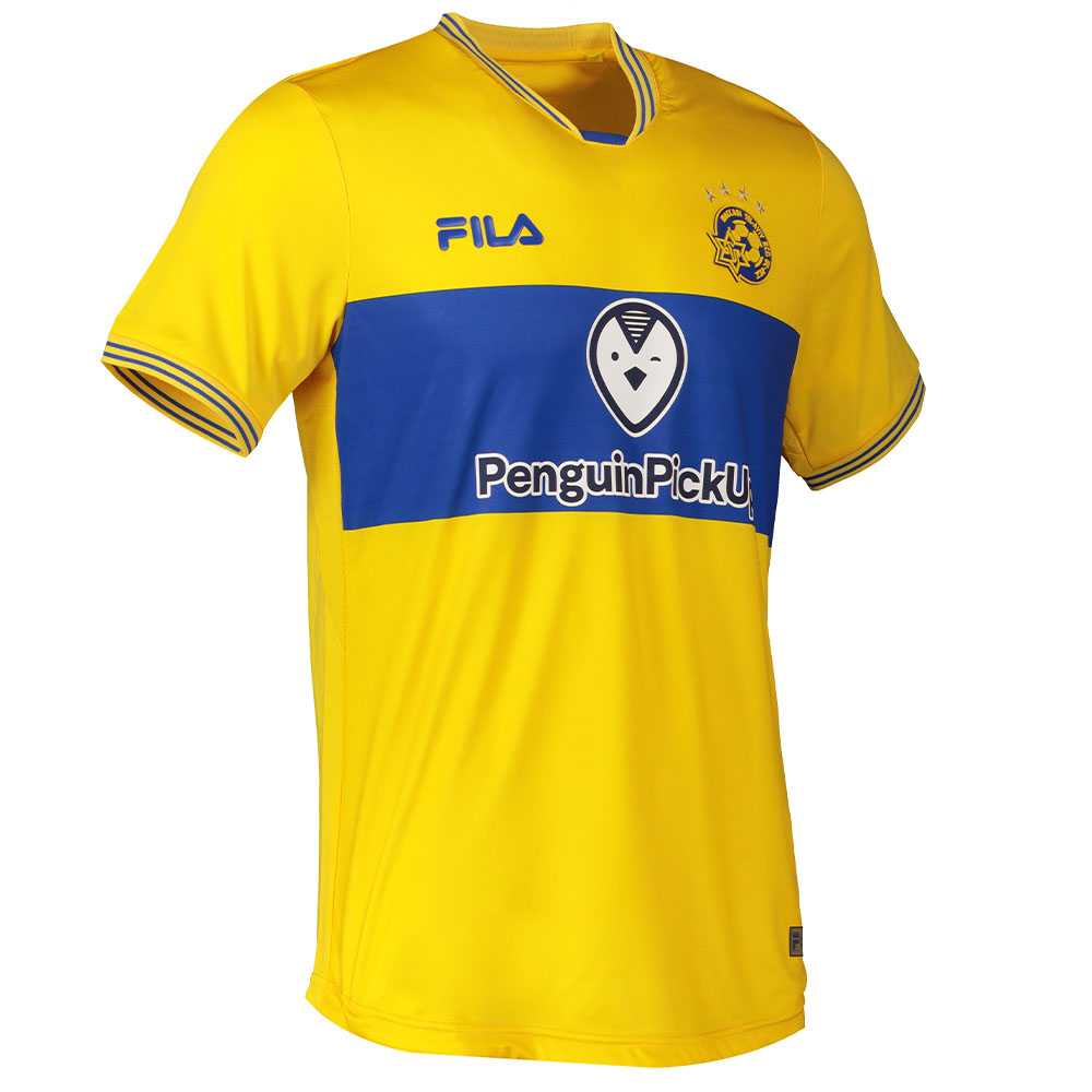 The yellow shirt has a blue band which houses the PenguinPickUp sponsorship logo. The blue also features via the Fila logo, club crest and the subtle trim on the neat neck and cuffs. The rear of the shirt carries supplementary sponsorship branding of partners Hisense and Nivea.