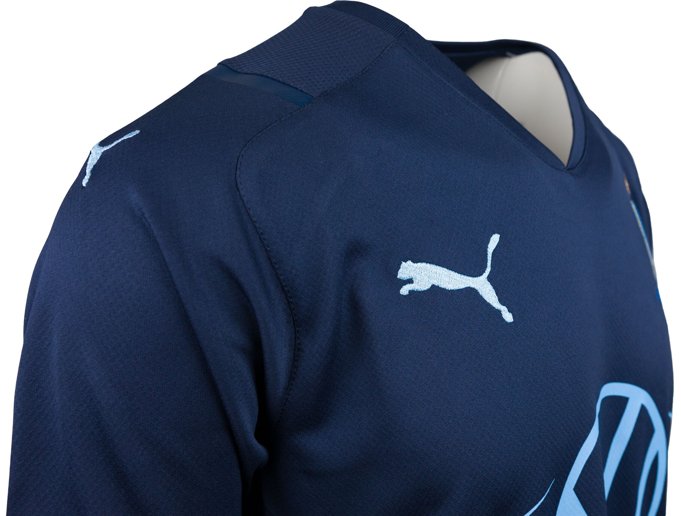 The dryCELL technology-incorporating dark blue shirt is relatively simple, with a full-colour crest topped with commemorative stars in gold and the Volkswagen sponsorship branding and Puma logos contrasting in light blue.