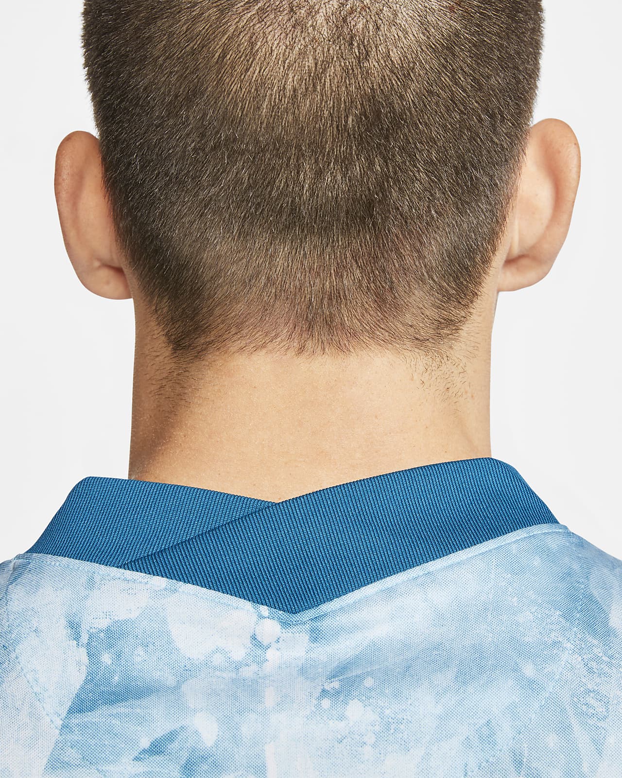 The new away jersey features a white base, covered in an icy-blue graphic, and framed by a darker blue trim on the collar and sleeves. Blue shorts and socks complete the look.