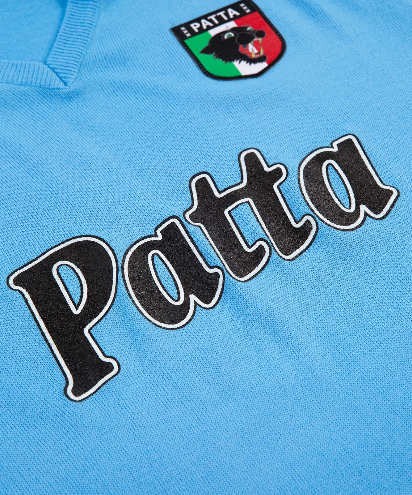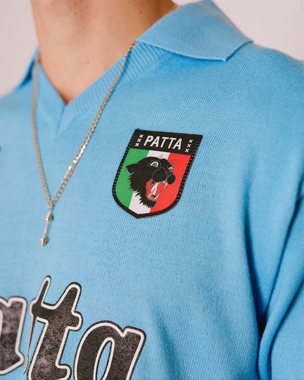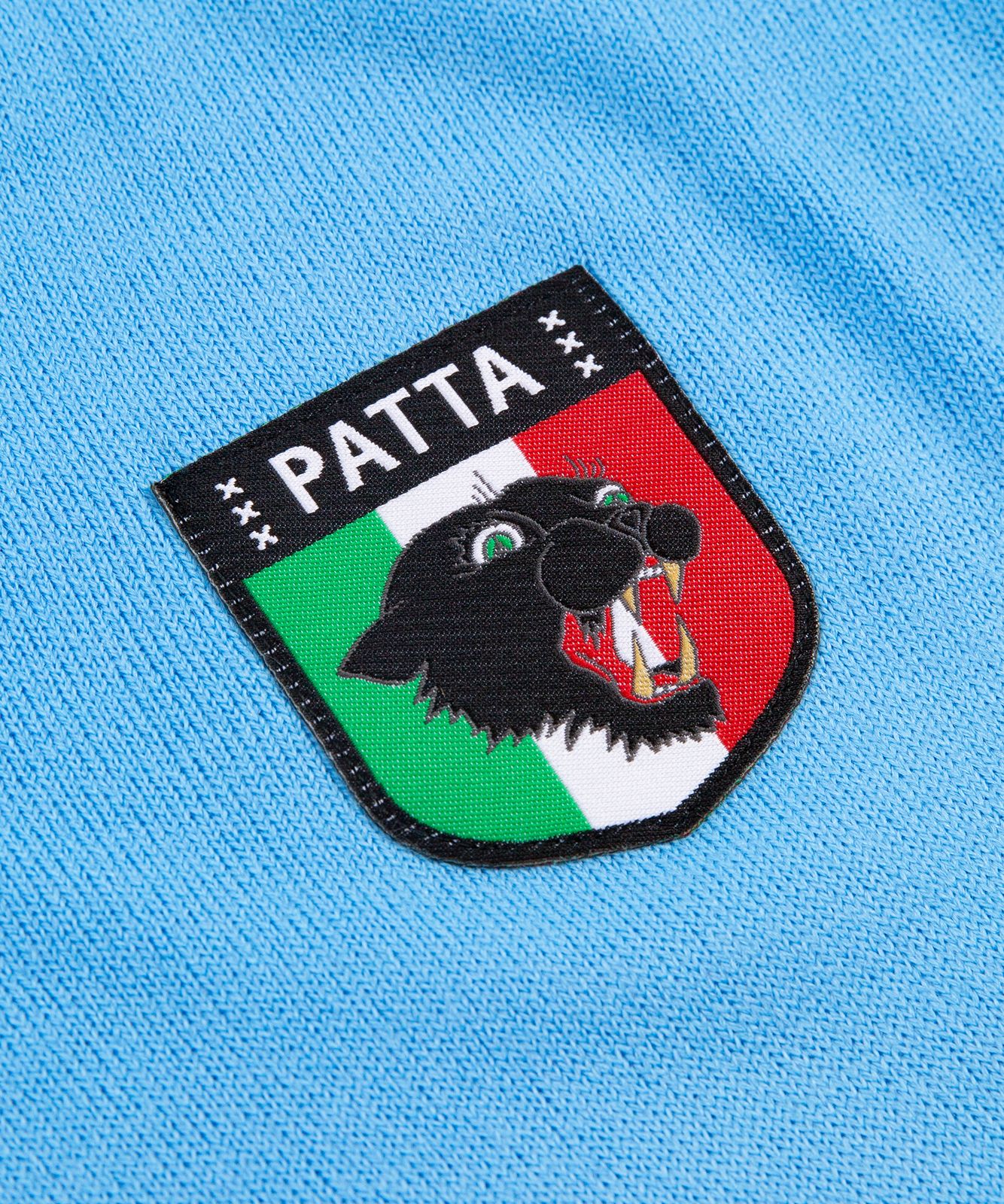 The front of the jersey sees the sponsor replaced with Patta branding, and features NR embroidered appliqué as well as a Patta Panther patch. The back of the shirt is decorated with number 10 in white fabric, sewn on with a zig zag stitch.