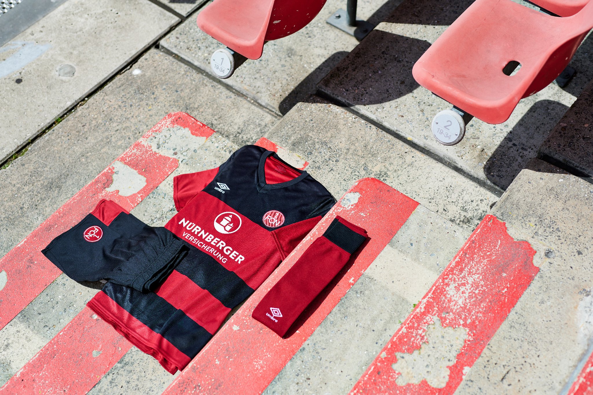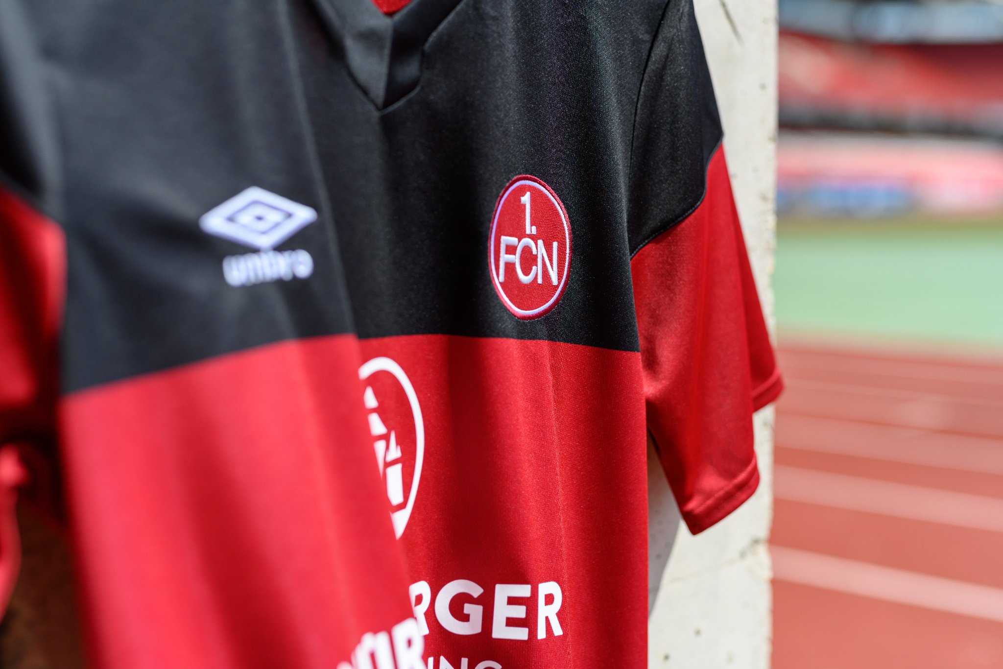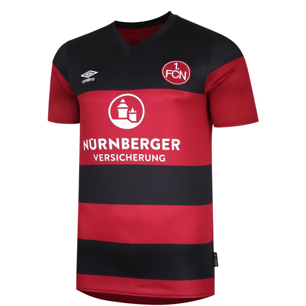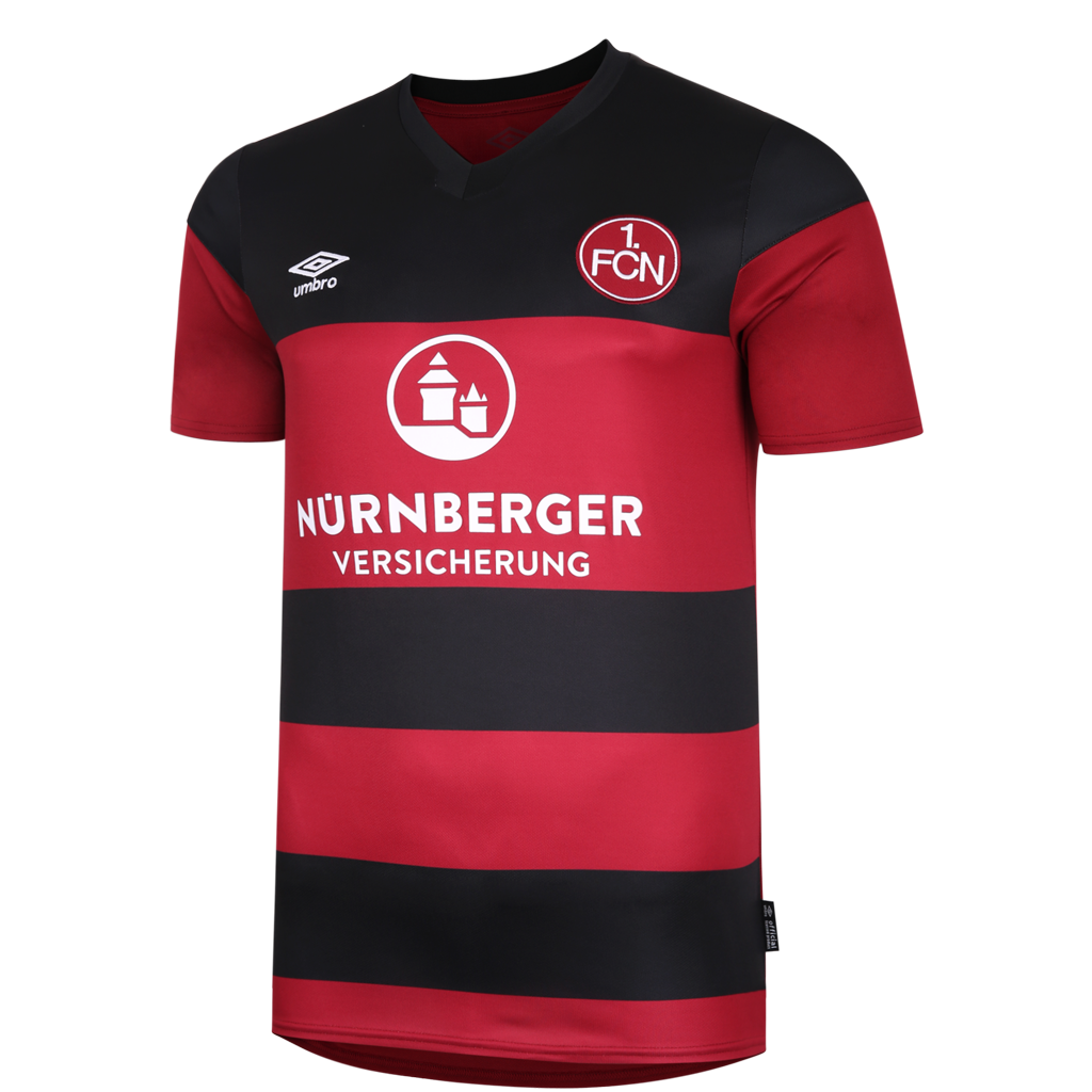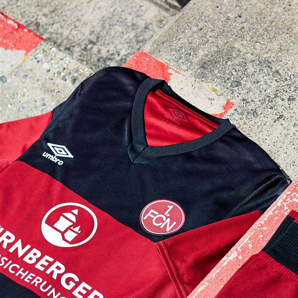 In addition, the embroidered FCN logo is emblazoned, along with the Umbro emblem, while the main sponsor "NÜRNBERGER Versicherung" is featured in white. The matching shorts are black and have red design elements.