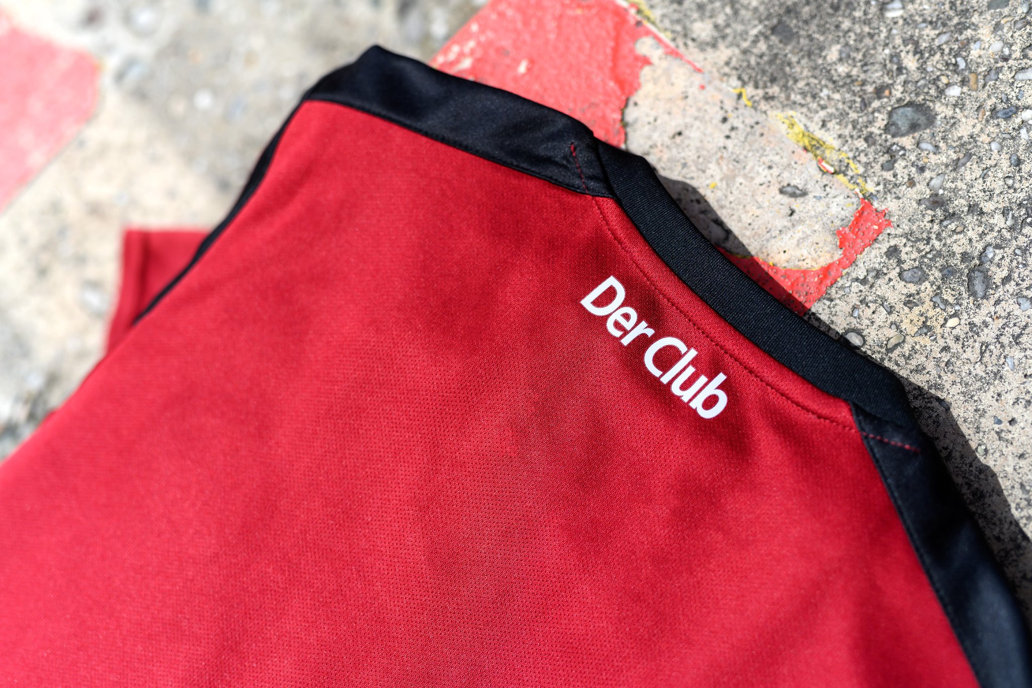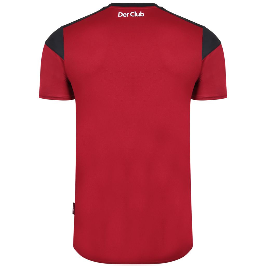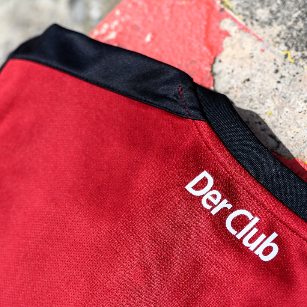 The new home kit from Umbro focuses on the traditional colours of the club. The red base colour is complemented by black horizontal stripes on the front and is equipped with a black collar with a ribbed V-neck.