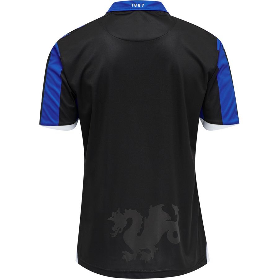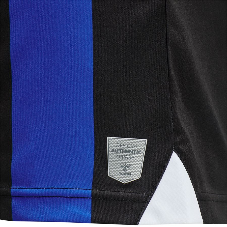 The neat collar remains in blue, while the stripes underlay the contrasting white sponsor rather than making way for it, the Hummel logo is also in white, and the crest is rendered in a monochrome palette to match.
