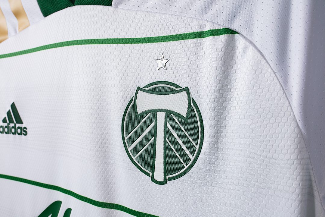 The wood grain lines that comprise the grey hoops on the jersey reference the wood forms seen throughout Portland’s downtown stadium, Providence Park.