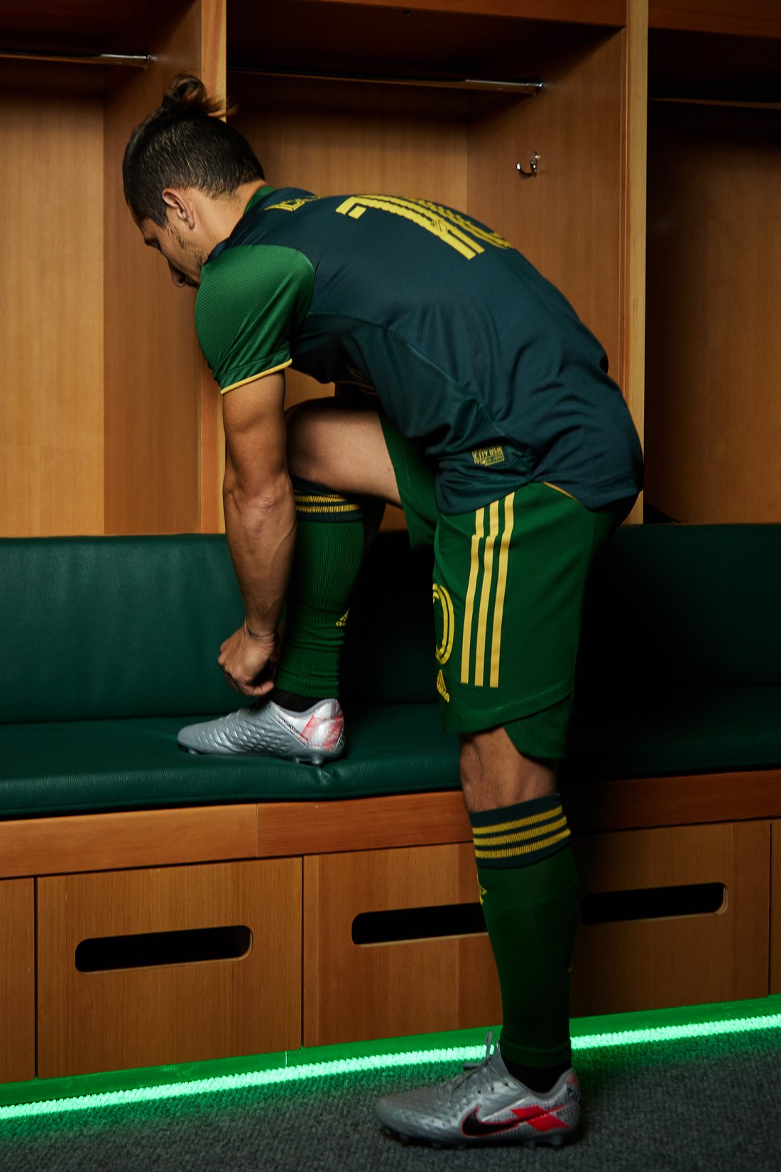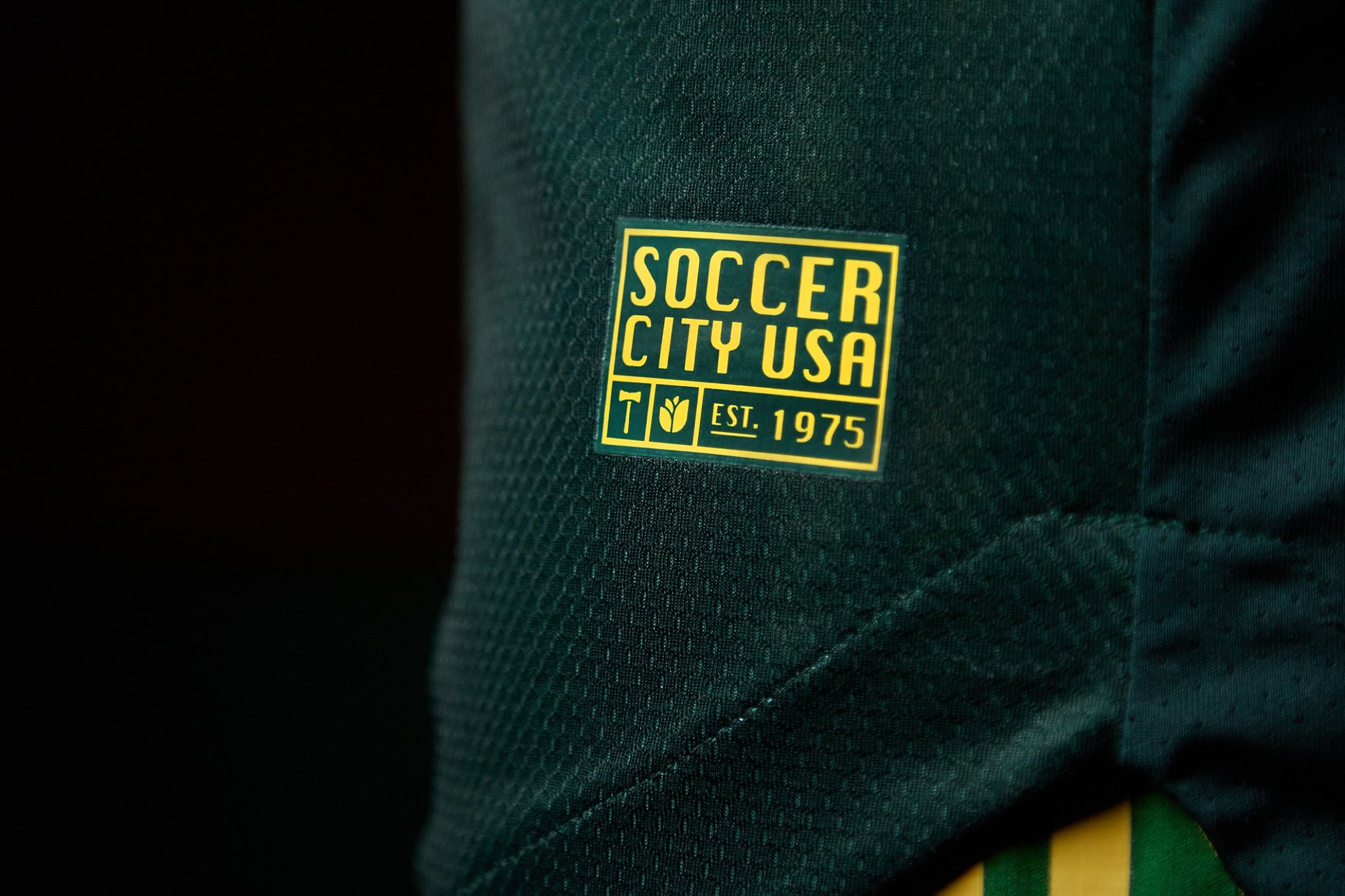 The 2021 jersey features a split color design and chevrons prominently displayed down the middle of the shirt. The jock tag displays “Soccer City USA” on the bottom left of the jersey, while also featuring “King of Clubs” inside the neck tape as a nod to the Timbers Army tifo from 2011.