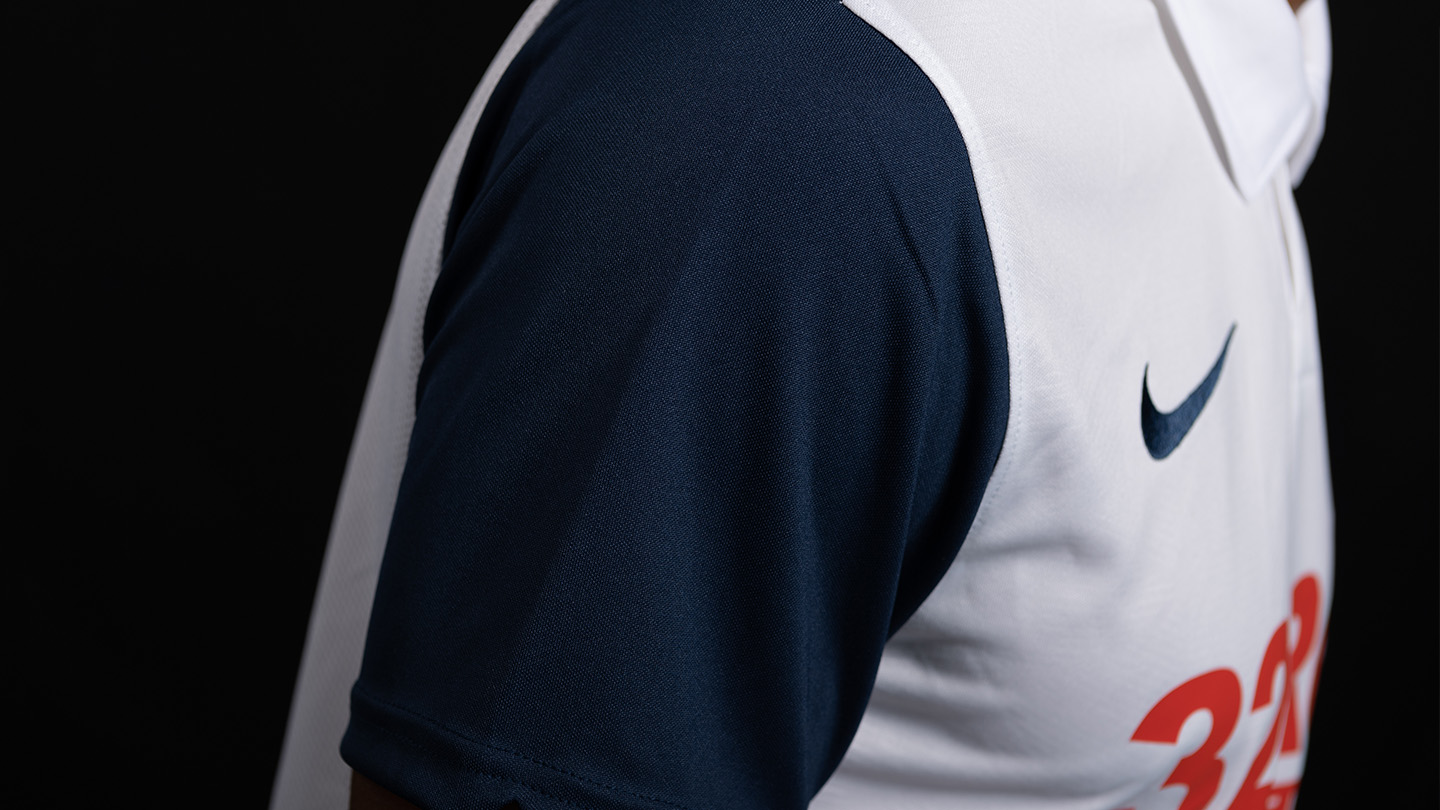 The brand new home shirt by Nike features a subtle embossed graphic design through the white front panel and features the return of navy sleeves and trim.