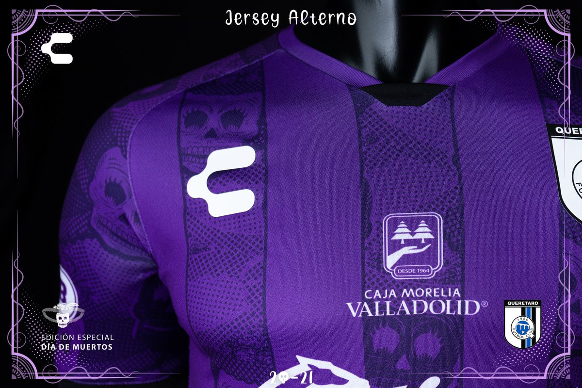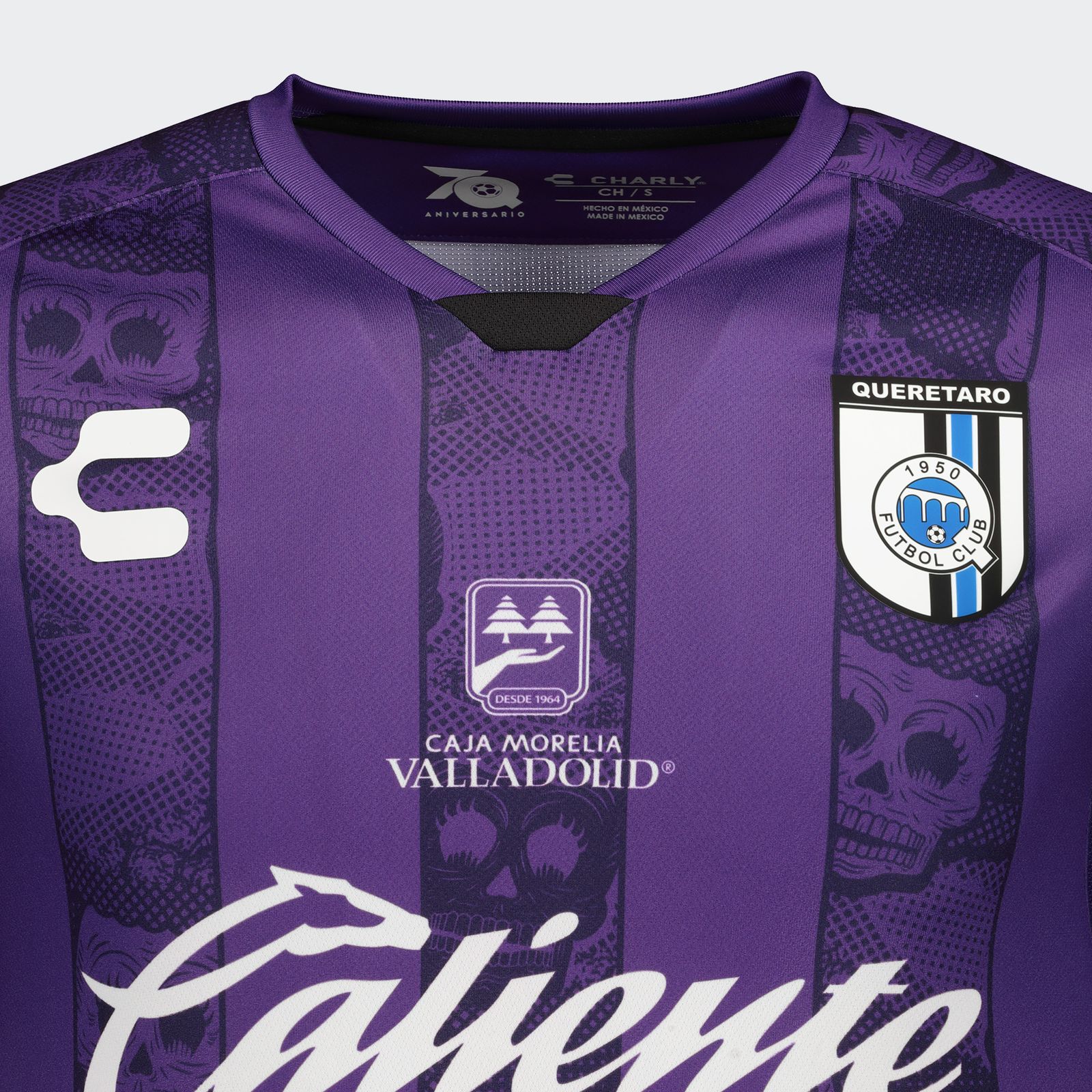 The Charly shirt for the Mexican Liga MX side is in purple with darker stripes featuring imagery denoting "La Catrina o dama de la Muerte" - the Lady of Death - an ever-present feature of Day of the Dead celebrations. The shirt has a neat collar and cuffs, while partner branding is in white and the crest in full colour.