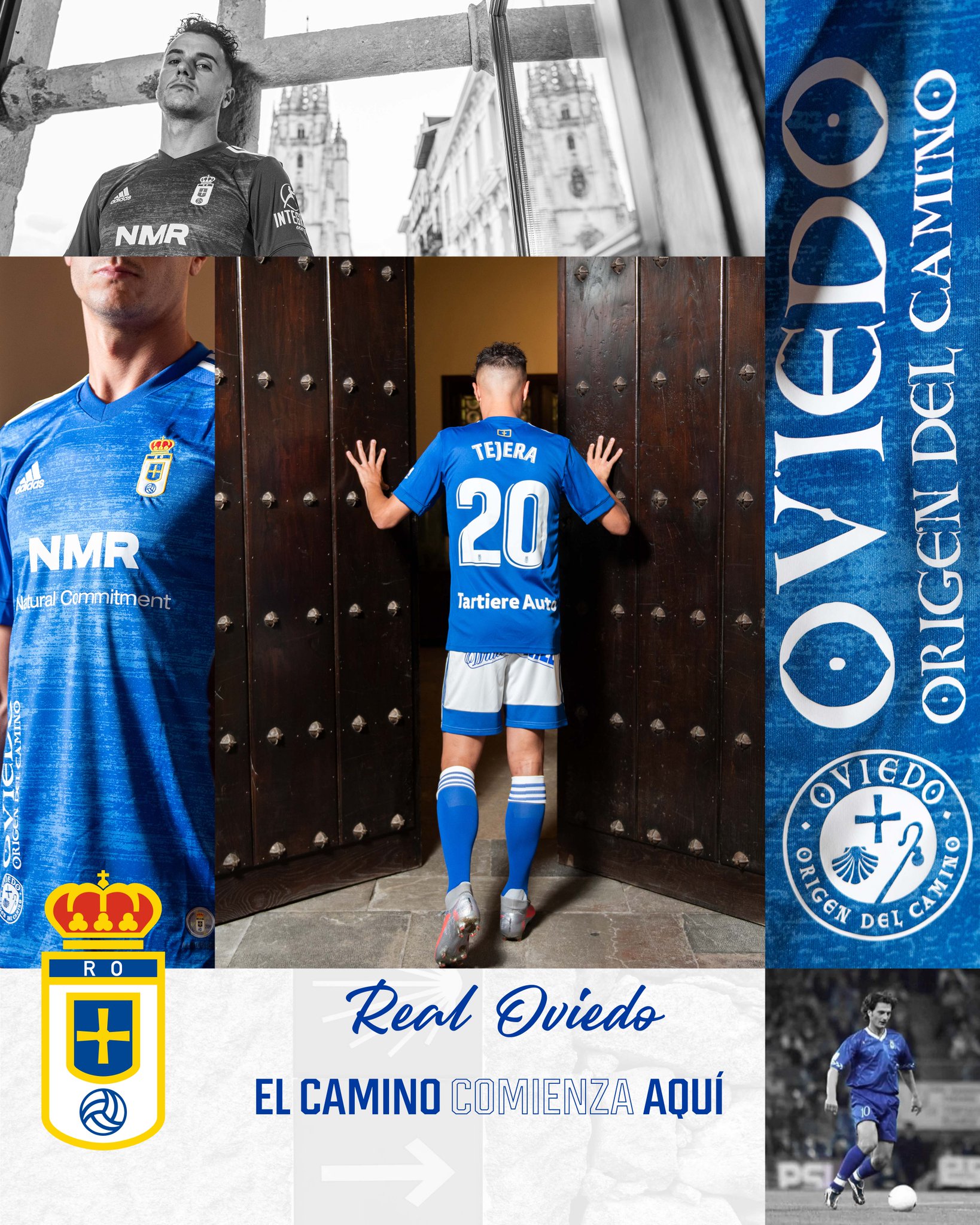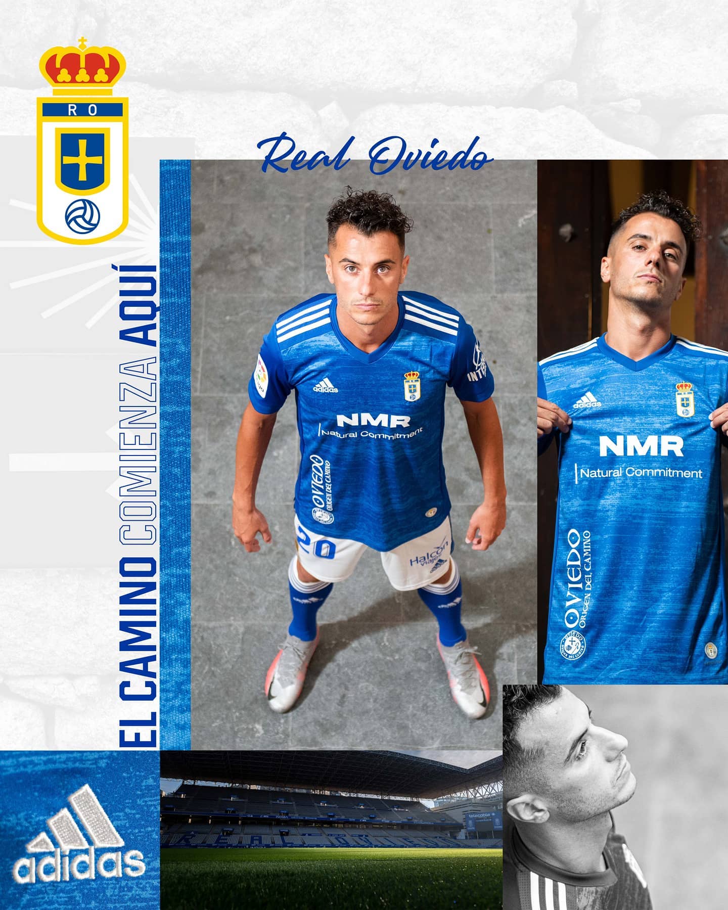 As well as the adidas logo, full-colour crest and “NMR Natural Commitment” primary partner branding on the front of the shirt, there is an “Oviedo - Origen del Camino” detail running vertically lower down, celebrating a traditional route of pilgrimage which begins in Oviedo.