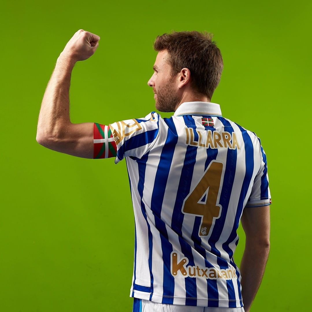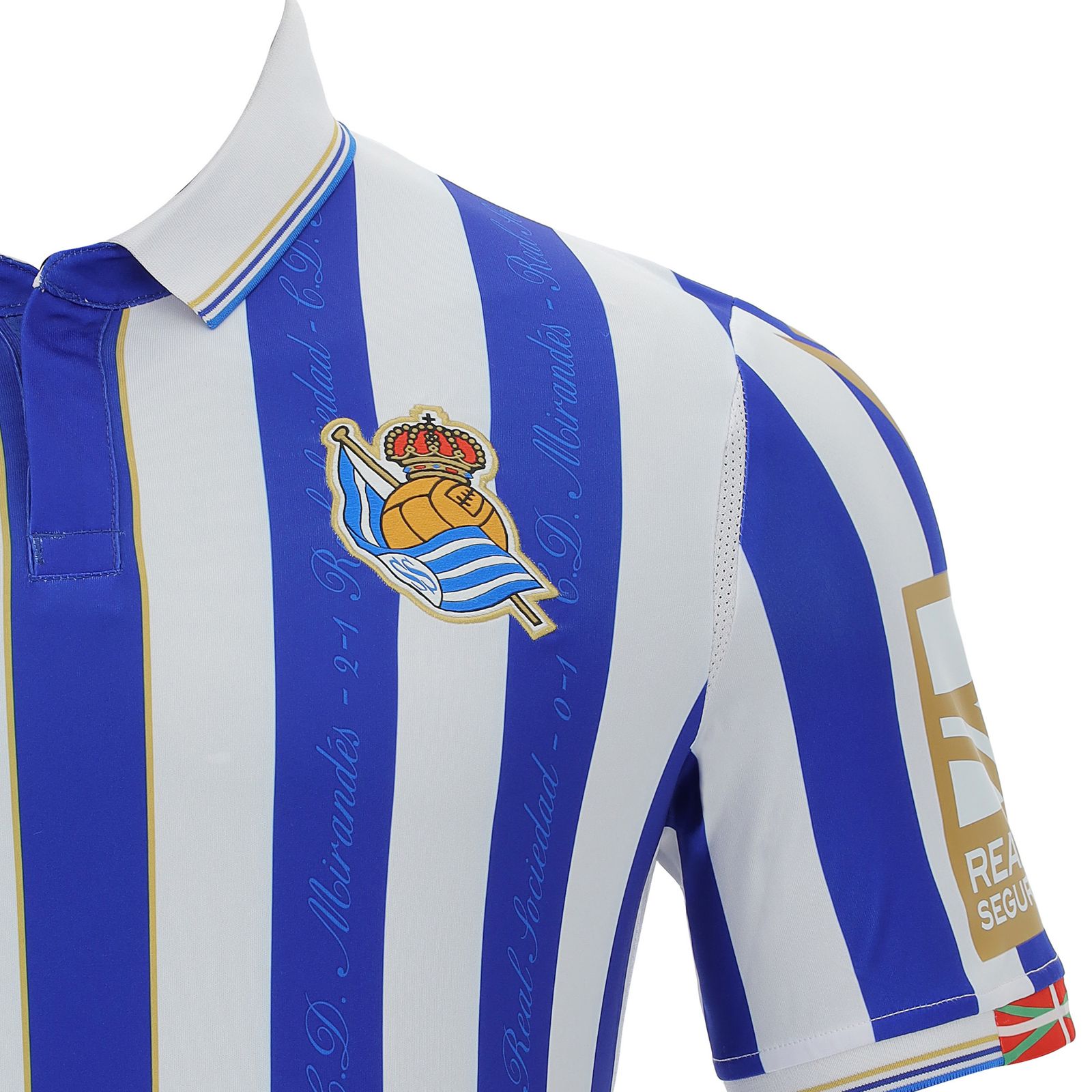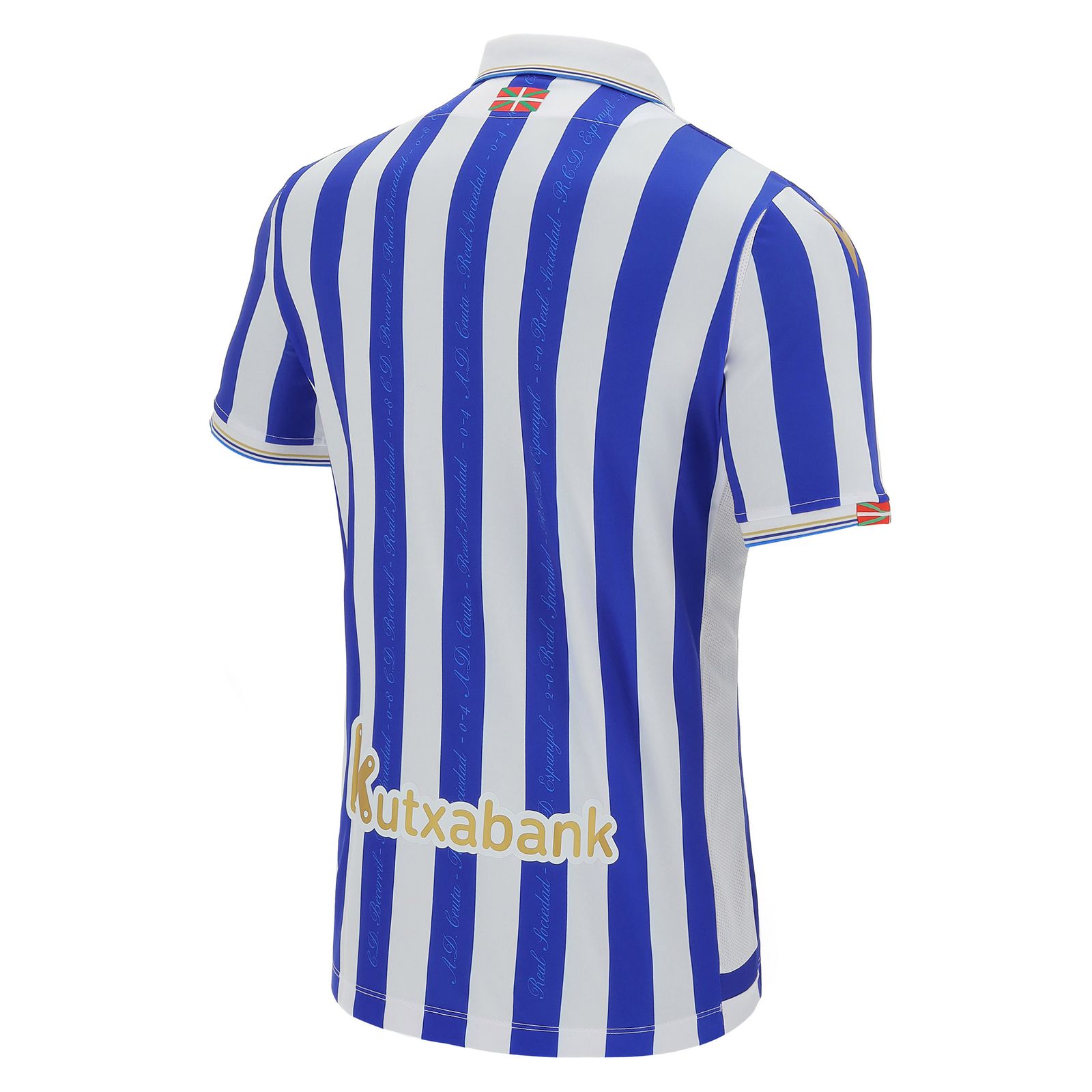 The shirt is reverting to the traditional txuri urdin, but now incorporating a touch of gold. Four stripes on the front and three on the back interspersed with the classic white stripes are the symbol of the team's journey to the final.