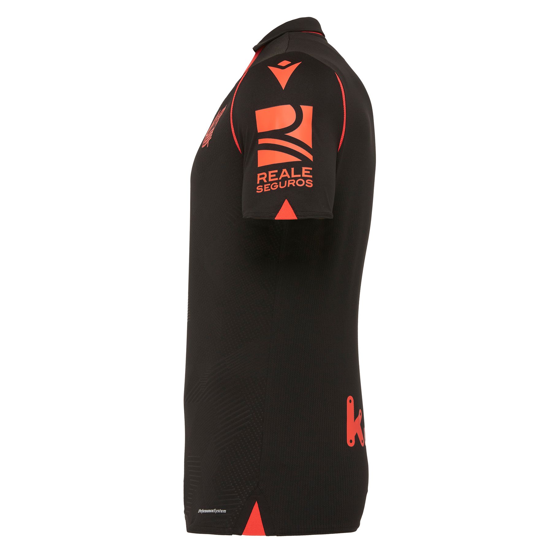 The 2020-21 primary change shirt is black with a textured pattern, with coral highlights on the shoulder seam, collar and Macron “Hero” logos. The crest follows this colouring too, with the shorts and socks that will be worn in the Spanish La Liga also in black and coral.