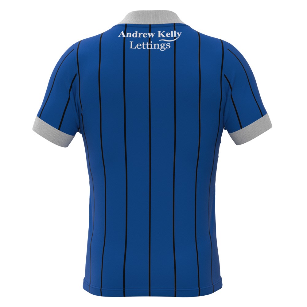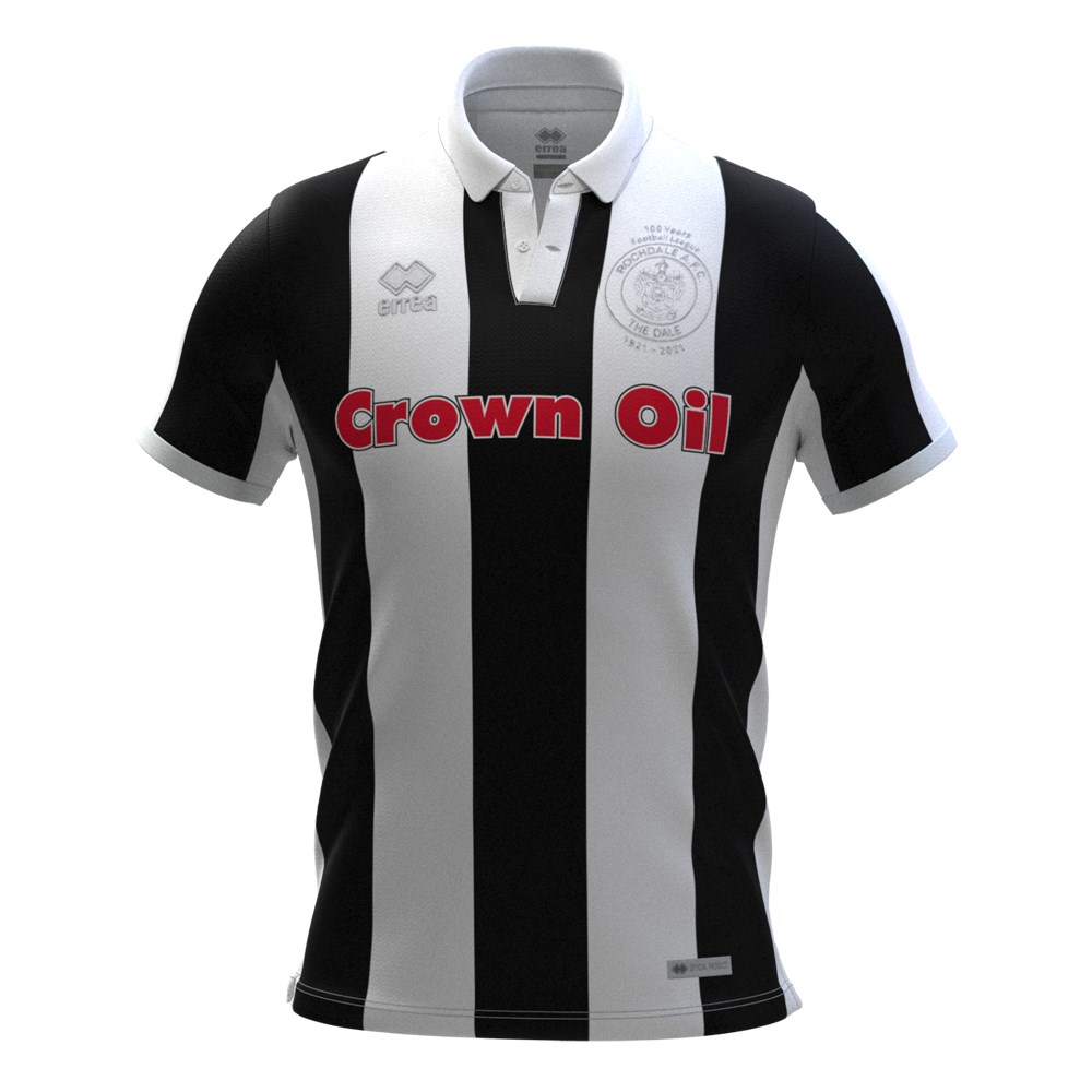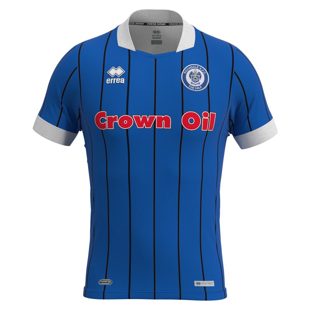 The home kit sees the return of Dale blue with a black pin stripe and white collar and sleeve, proudly sponsored by Crown Oil and Andrew Kelly Lettings.