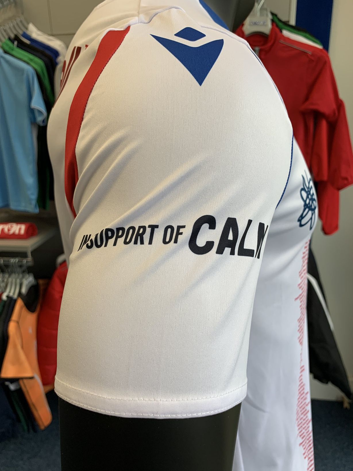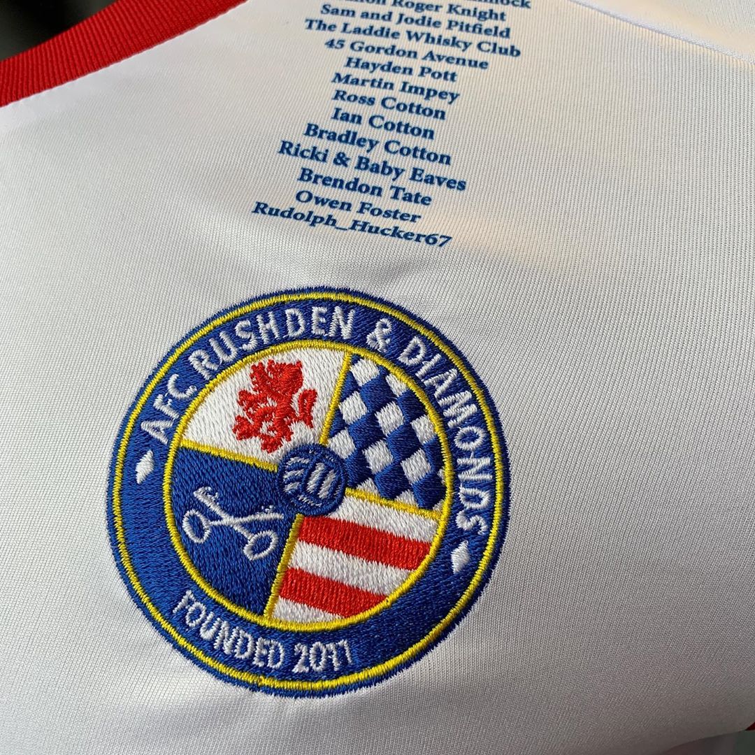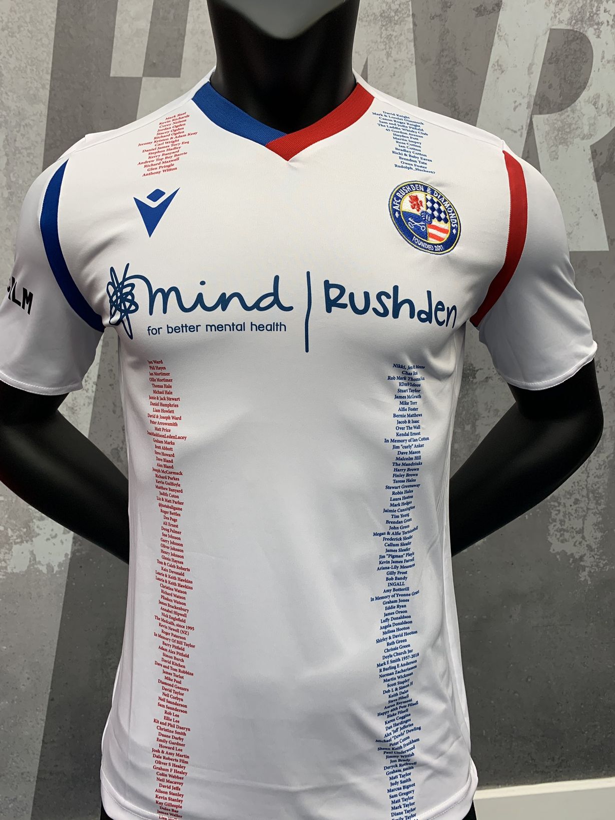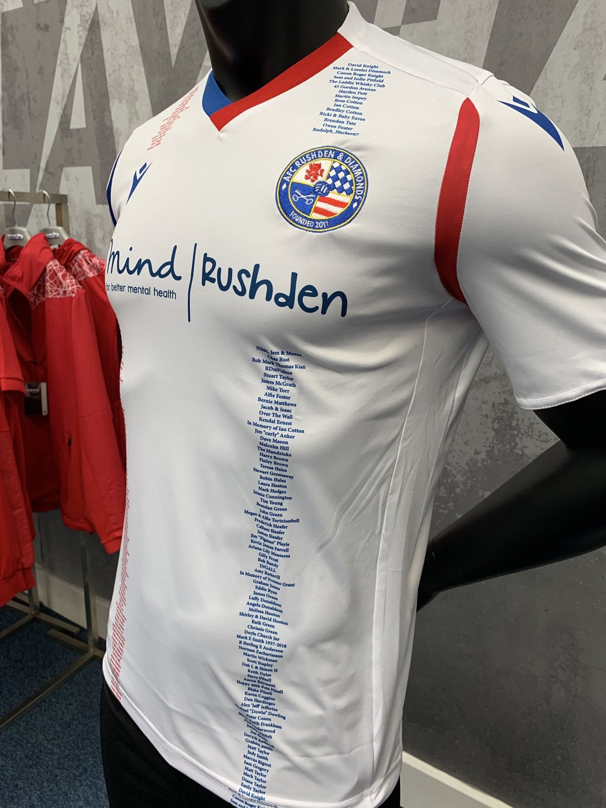 The new shirt features names of supporters printed within the fabric, along with logos of Mind Rushden, In support of Calm, and Fuelsell, on the shorts the club will wear the Kick it out logo.