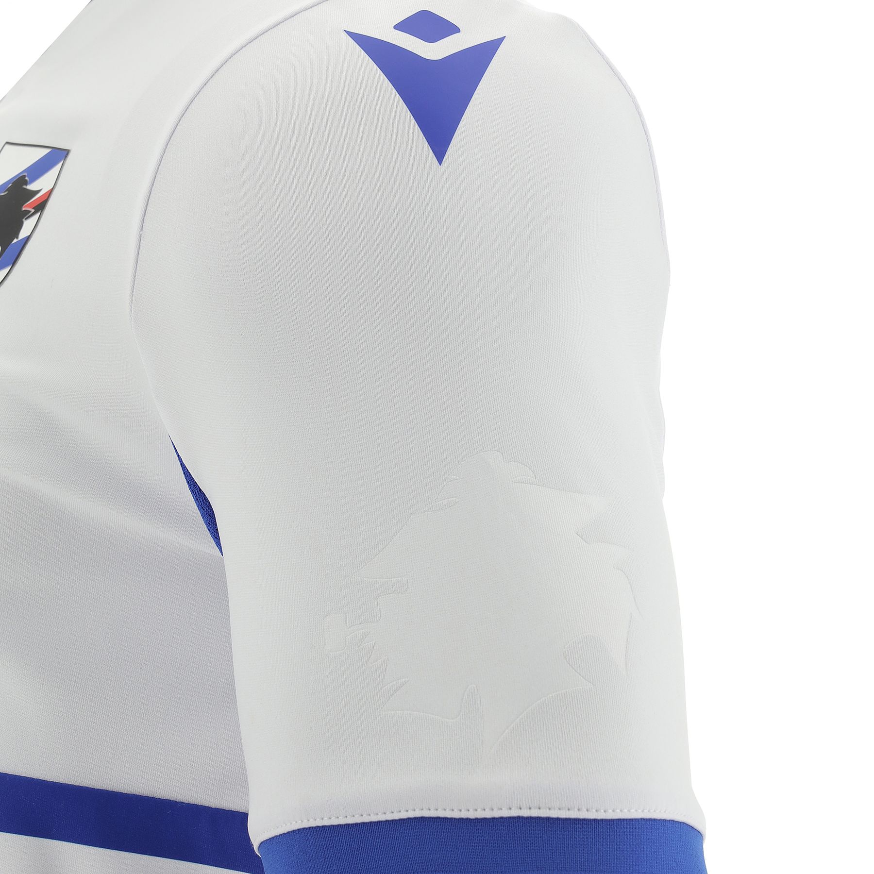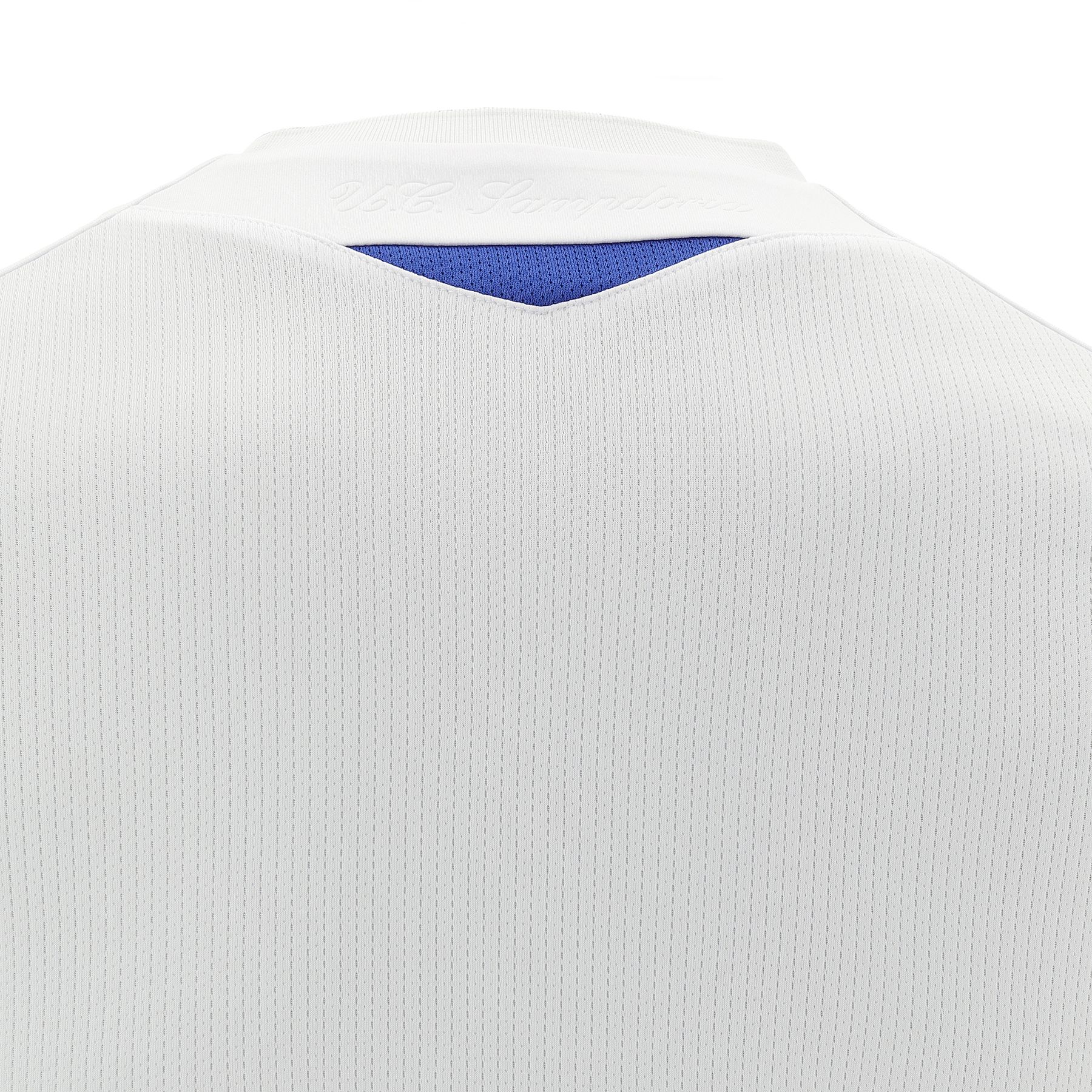 The first Sampdoria 2020/21 Away shirt is white and maintains the graphic setting of the Home version. The neck is V-shaped and the edges of the sleeves are in royal blue knitwear.