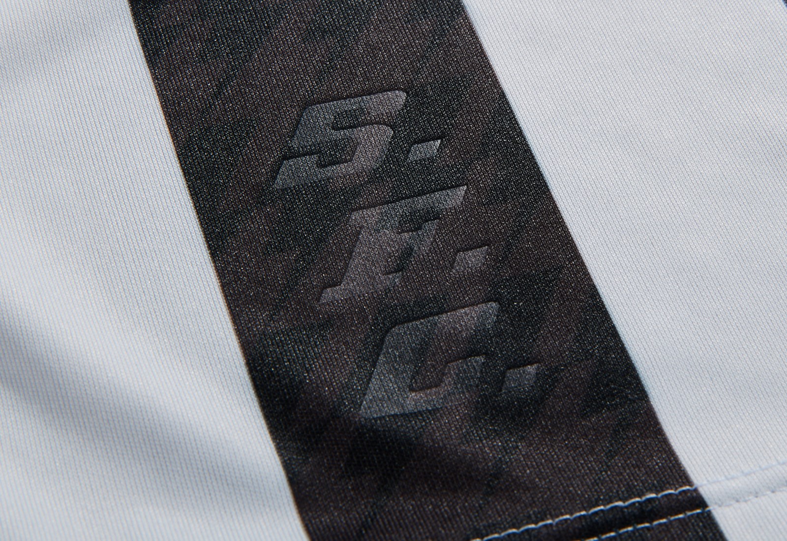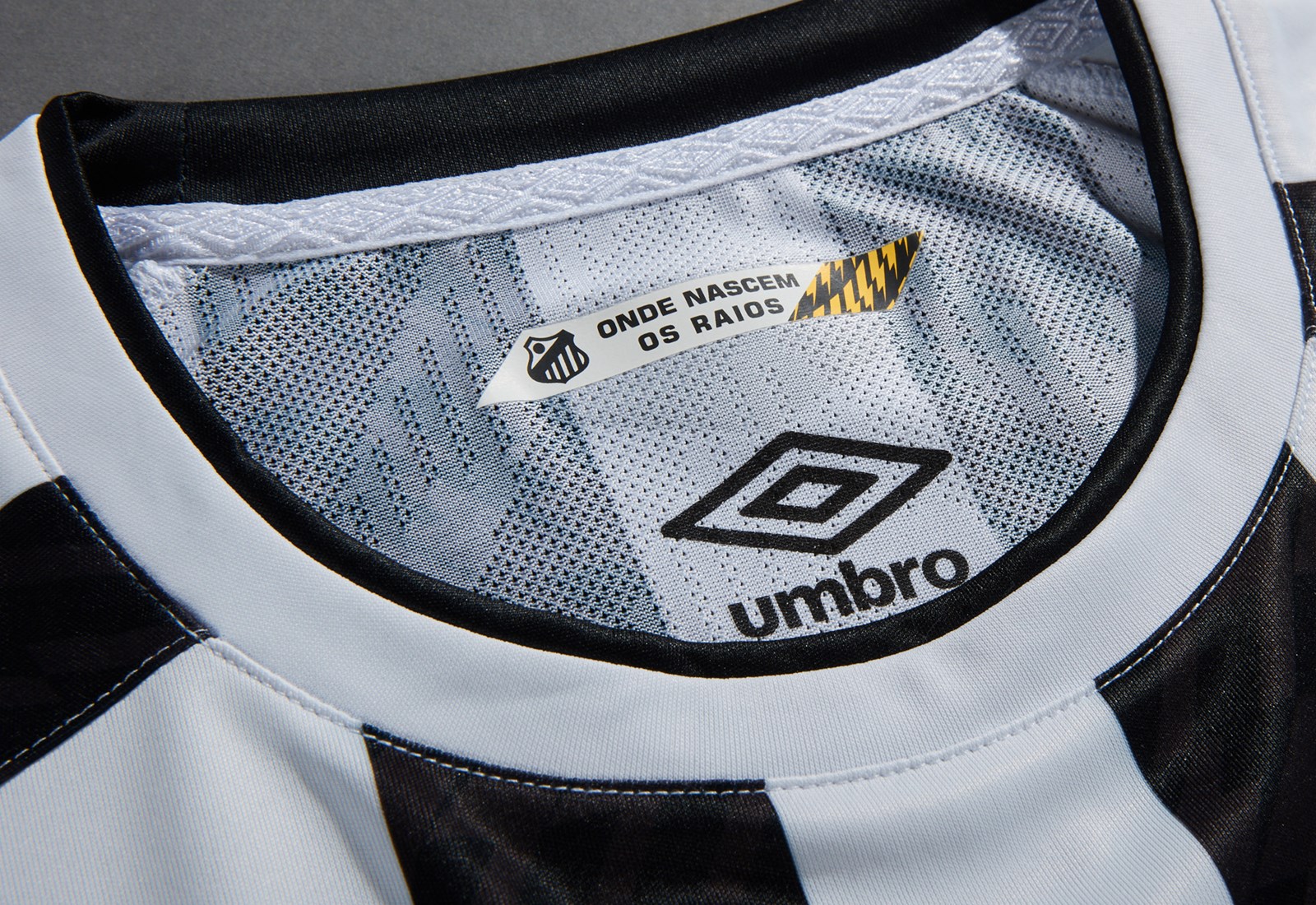 The Umbro design features the famous Santos black and white stripes, textured, with the iconic pattern of course repeated in the instantly recognisable crest.