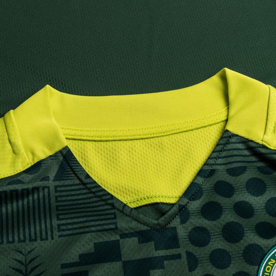 The new change shirt is in tones of green, with the dark hues rendering - on the front of the trunk - the Senegalese art-referencing pattern that is so vibrant on the Home version.