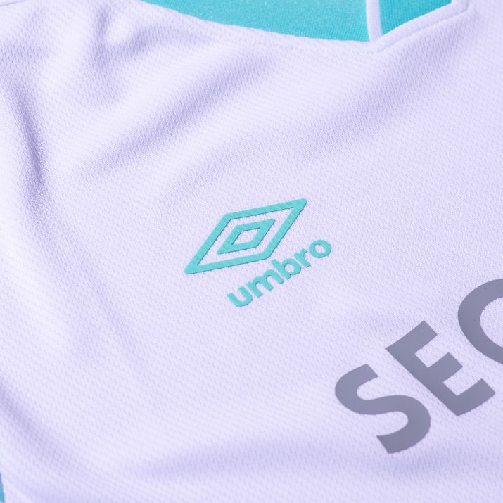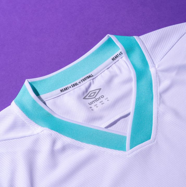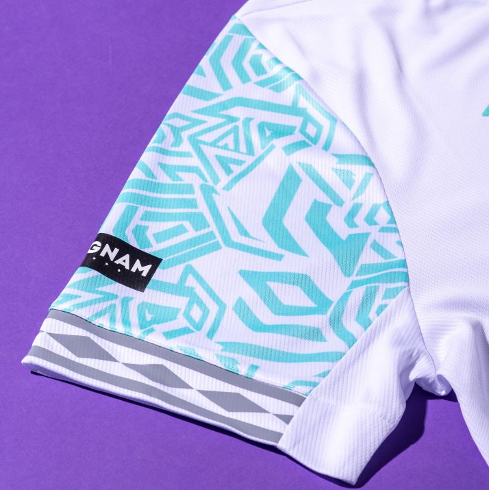 The white away jersey keeps it simple with a zigzagged diamond pattern on the sleeves finished in cool mint. Trims have been popped in grey.