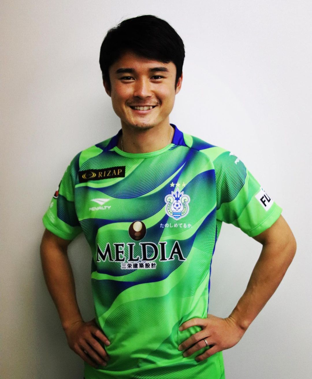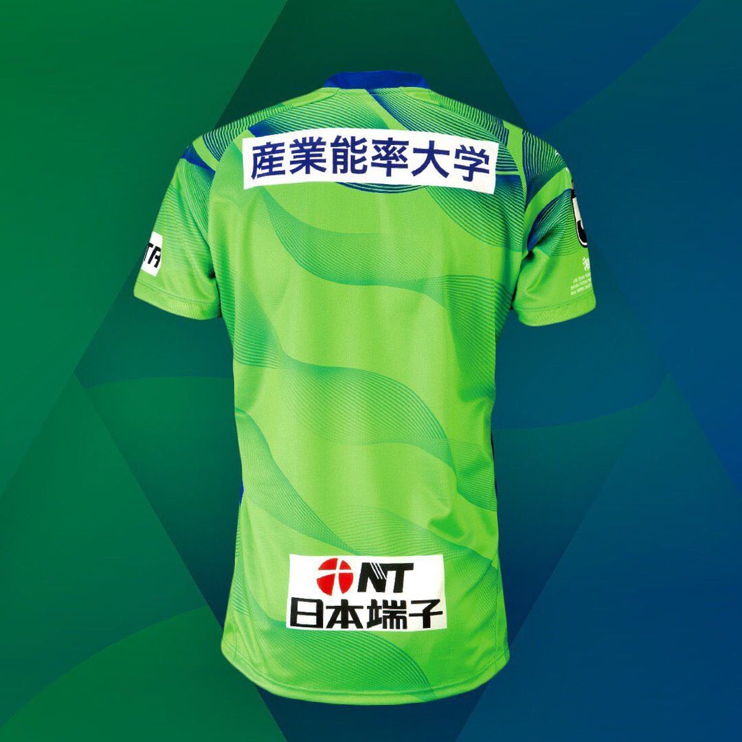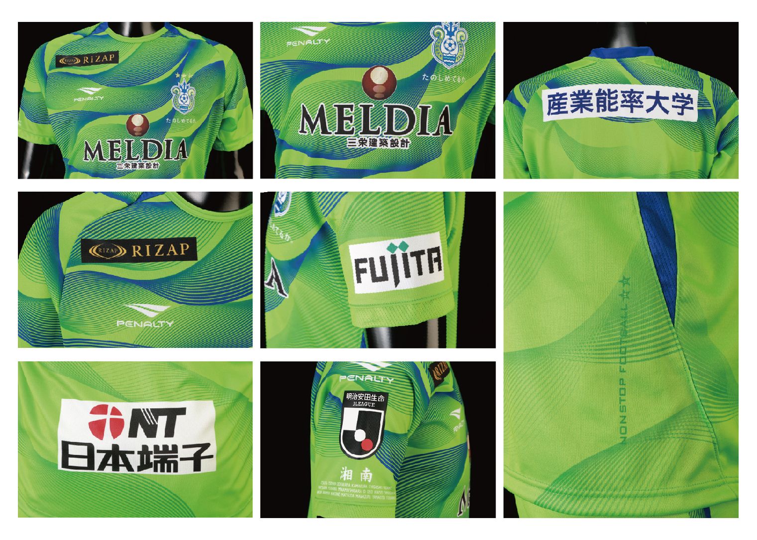 The Penalty design is predominantly in green and has a stylised wave pattern nodding to the Shōnan coast, with the upper portion partially coloured in blue. The crest is in full colour along with the patch-style partner branding while the manufacturer’s logo and the script on the right sleeve contrast in white.