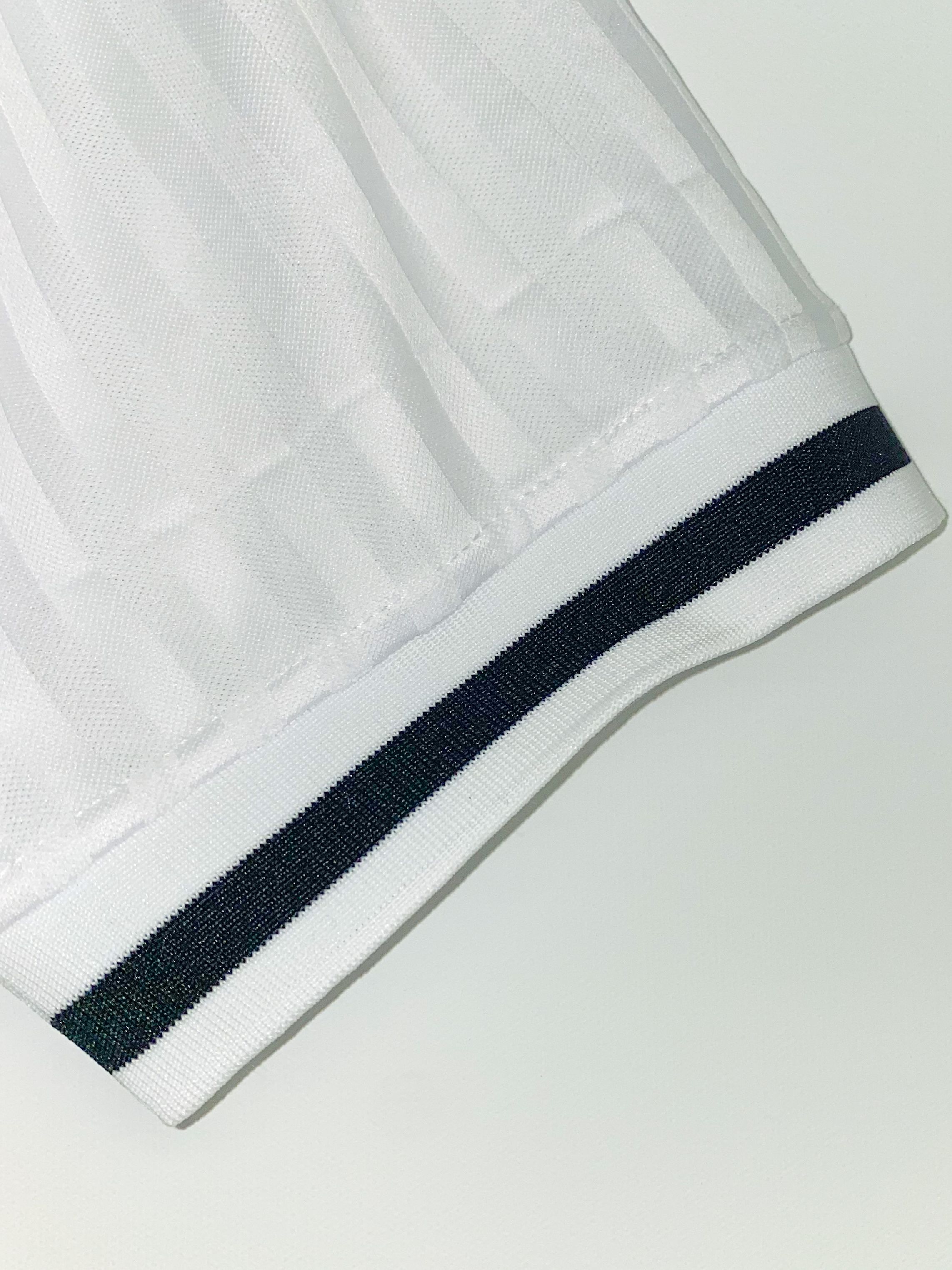 The neat 2021 design features a shadow striping pattern to the white base, with white and black overlapping v-neck and cuffs.