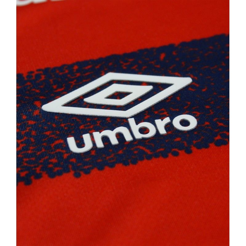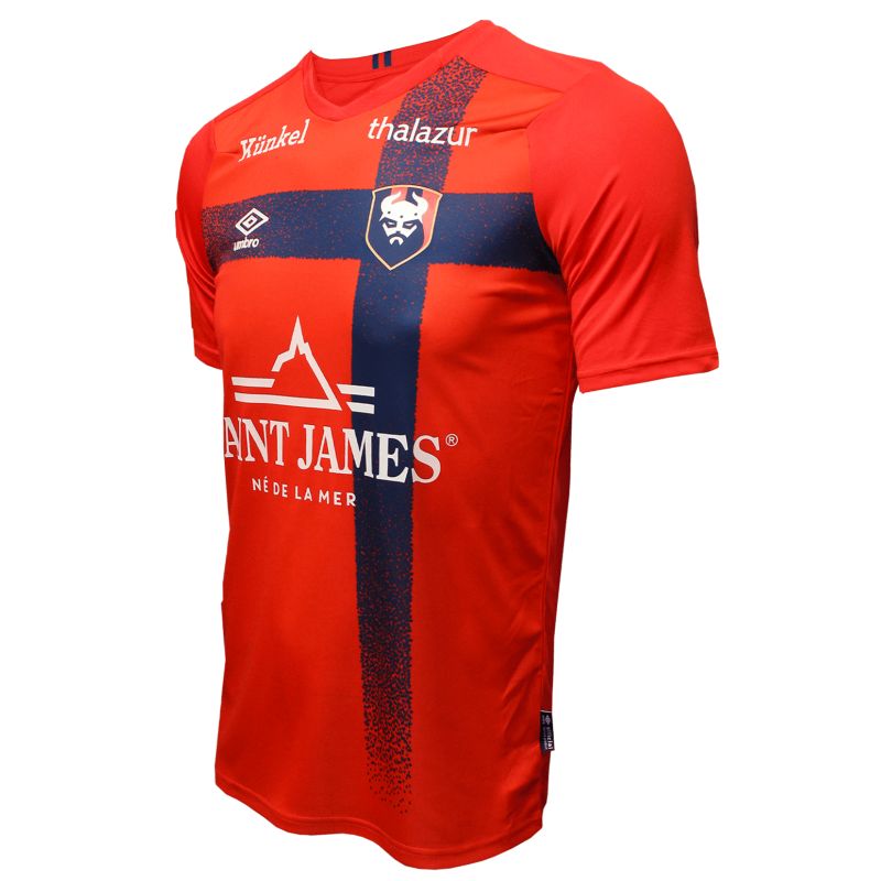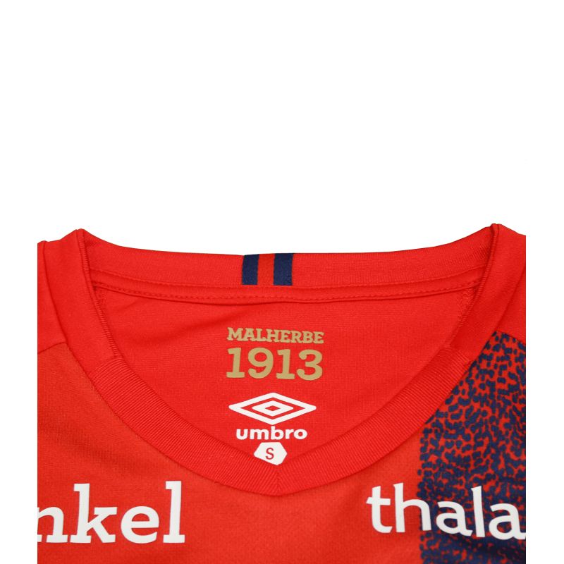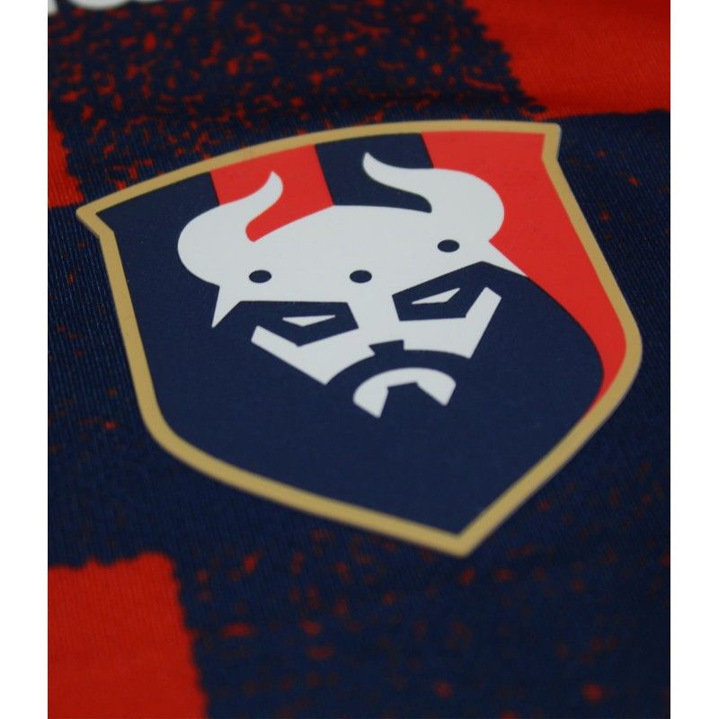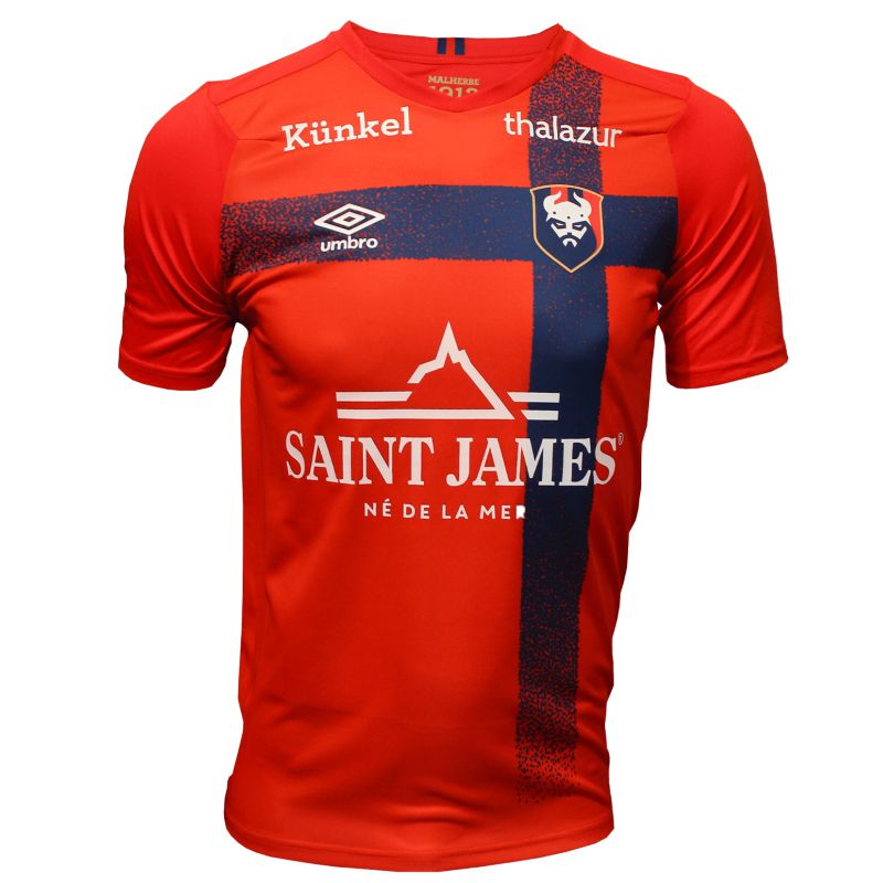 The red shirt has a focal point of the distressed blue cross which has its intersection behind the modern, full-colour crest. Despite the colouring, the shirt design is designed to evoke the St George’s Cross, with the thinking being that it is both the symbol of England, from which manufacturer Umbro hails, and of Normandy, where Caen is located.