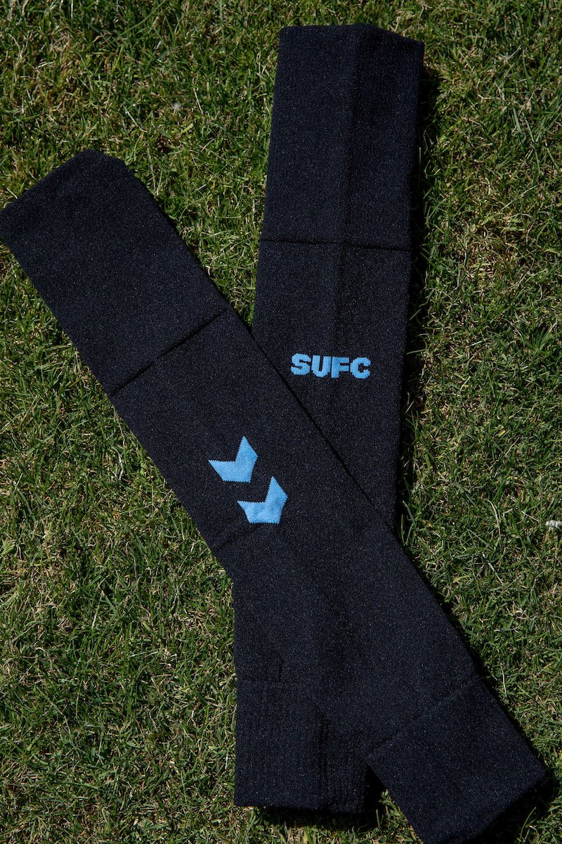 It is accompanied by black shorts and socks with the sky blue trim on the famous Hummel chevrons situated on the side of the shorts and the ‘SUFC’ stitching on the socks.