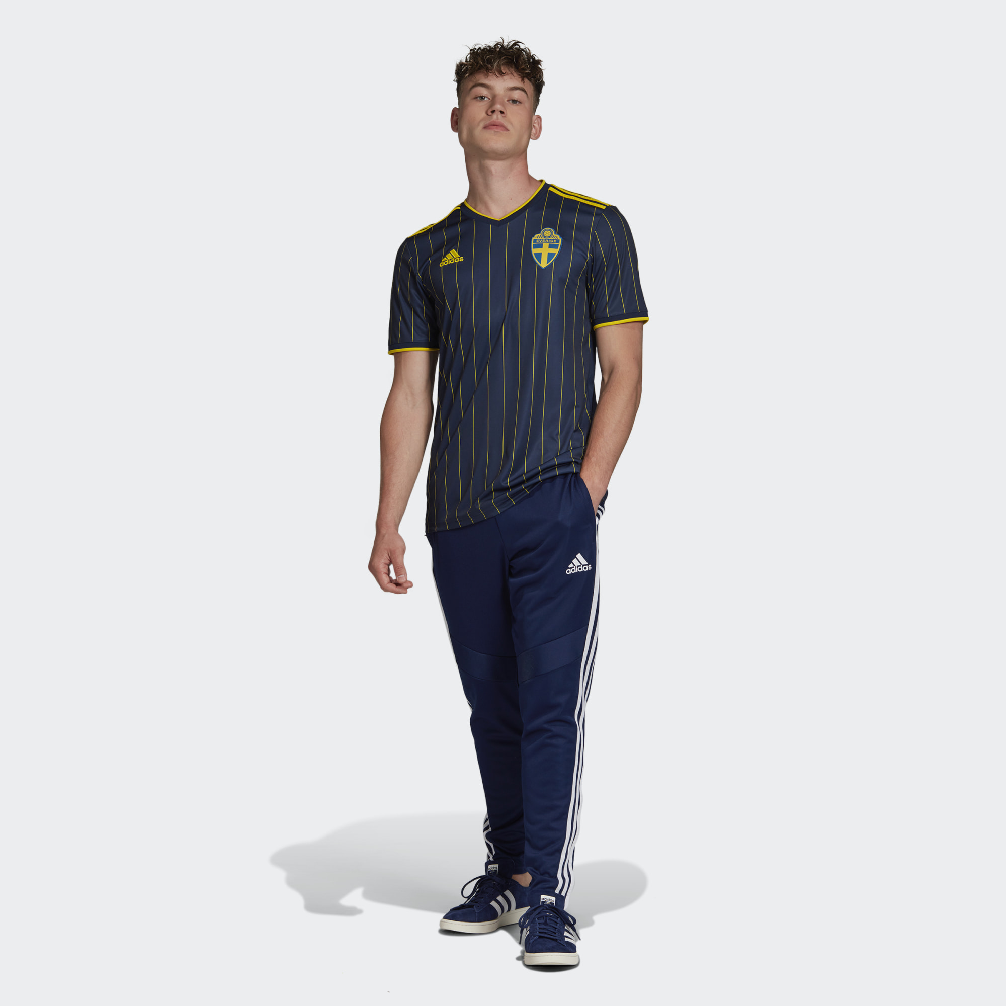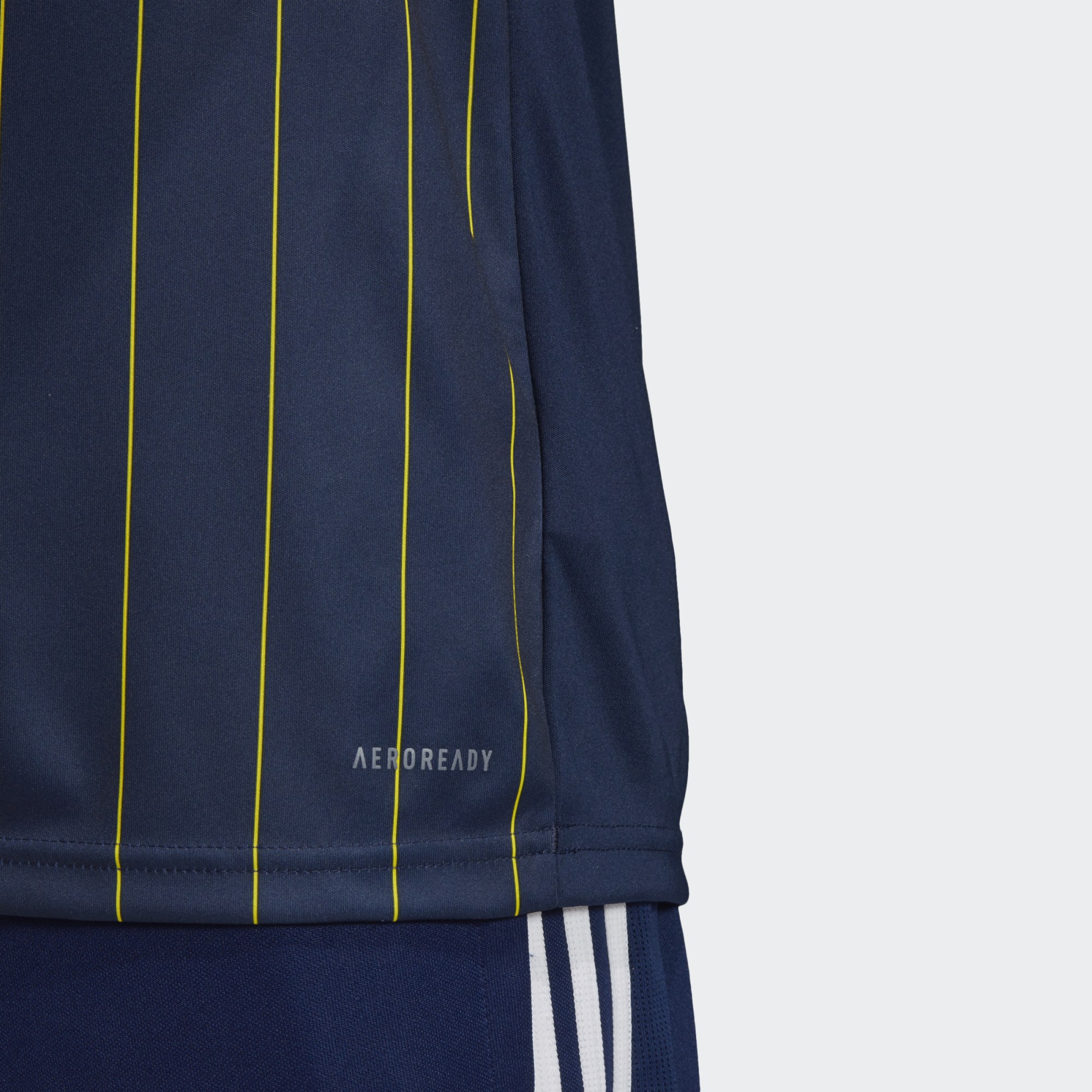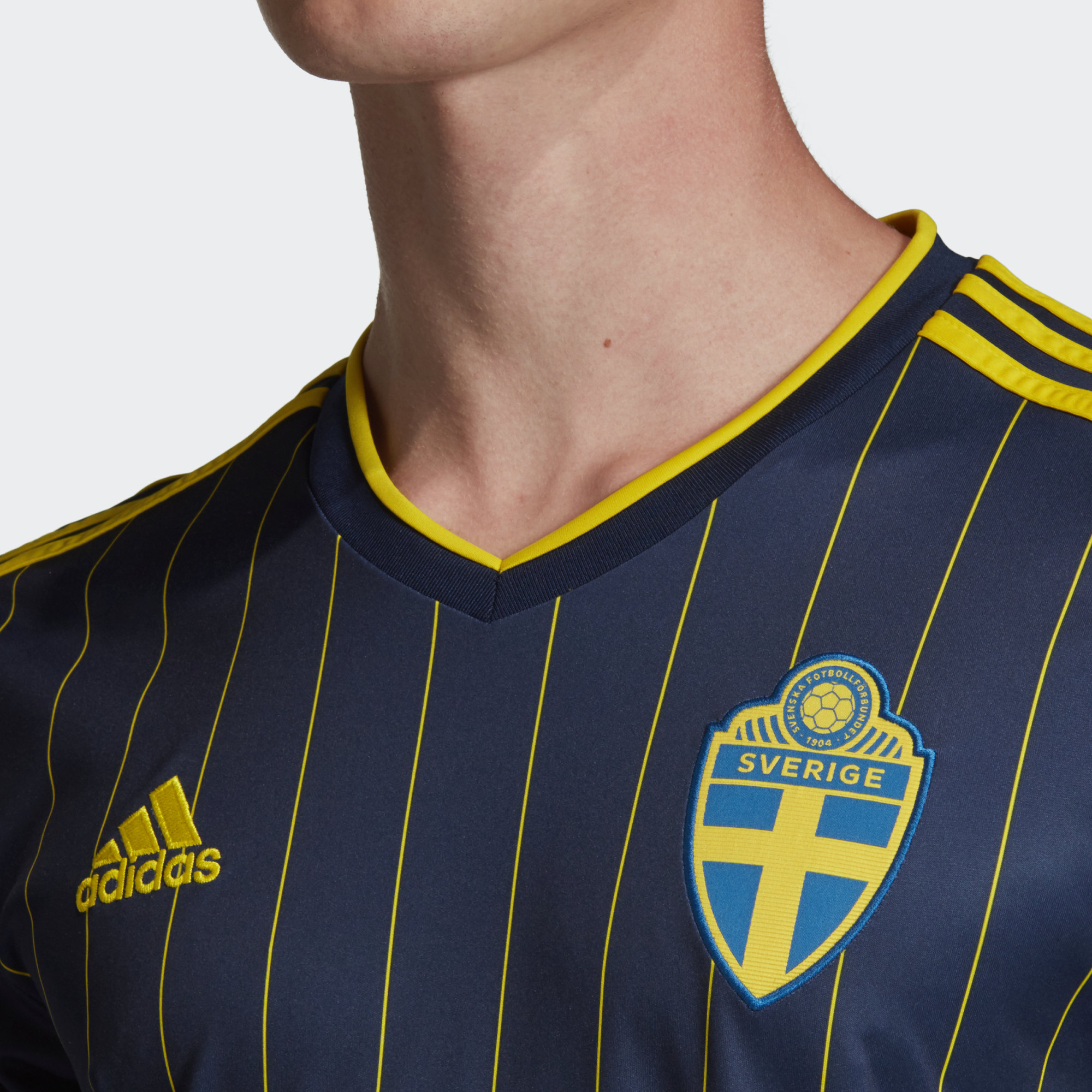 Yellow is used as a further accent on the “V”-style neck, the cuffs and in the adidas branding, while the crest appears in full-colour and standard toning.