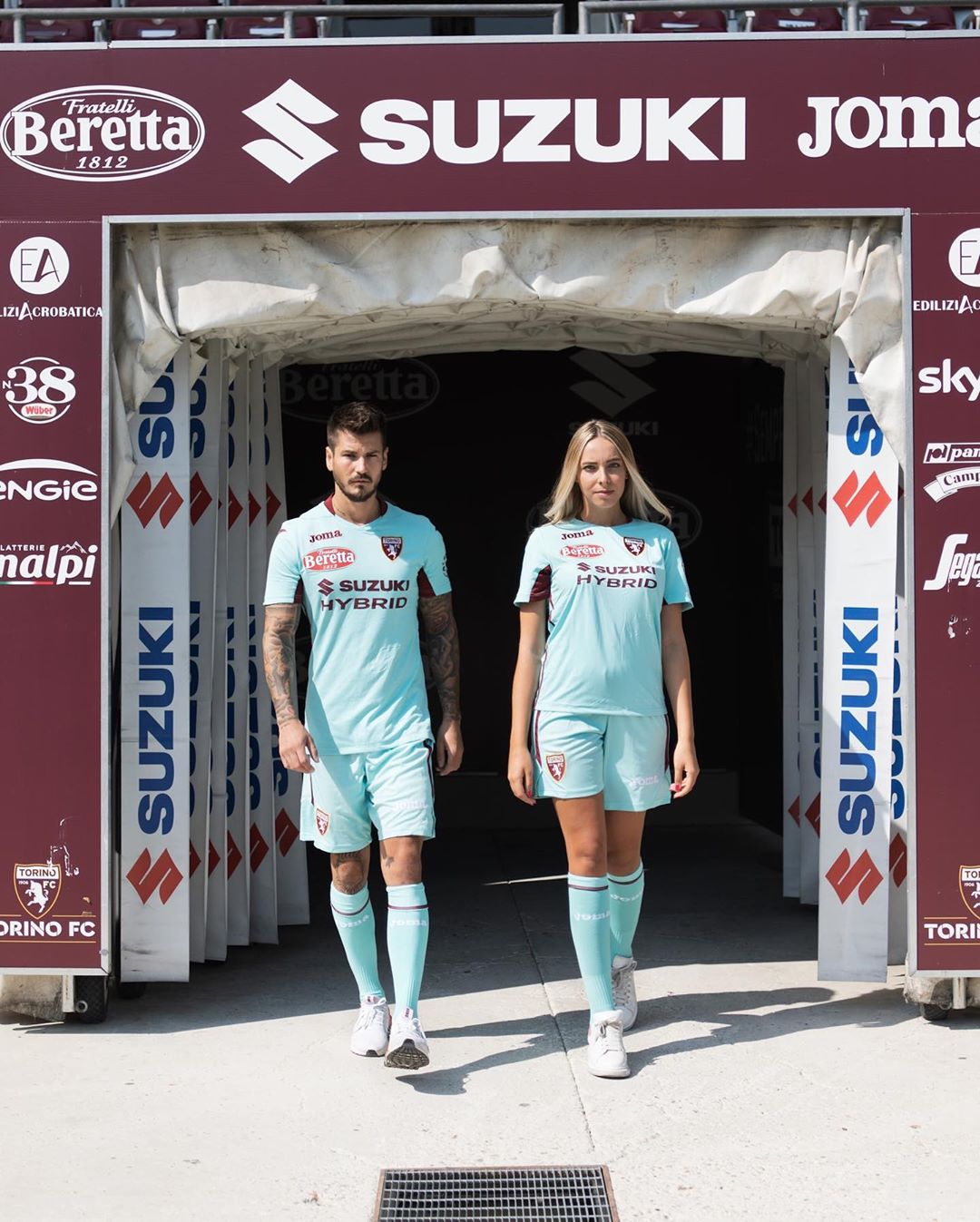 Said tone on the shirt is contrasted, in the main, with the famous garnet of Torino’s Home releases, and this stretches from the Joma logos, through the upper back club identity, to the vast majority of the partner sponsorship branding - including the “Suzuki Hybrid” legend front and centre.