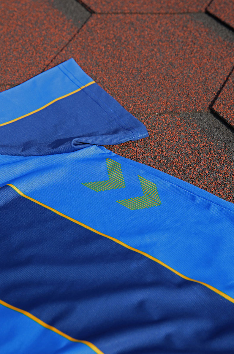 The new Hummel primary shirt for the intercontinental tournament features thick striping in two tones of blue, sandwiching thin gold stripes.
