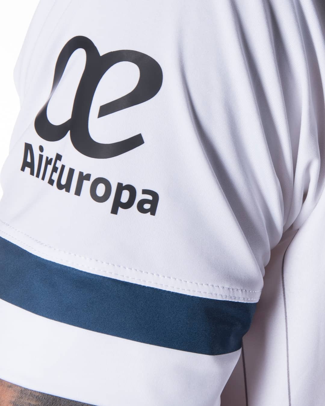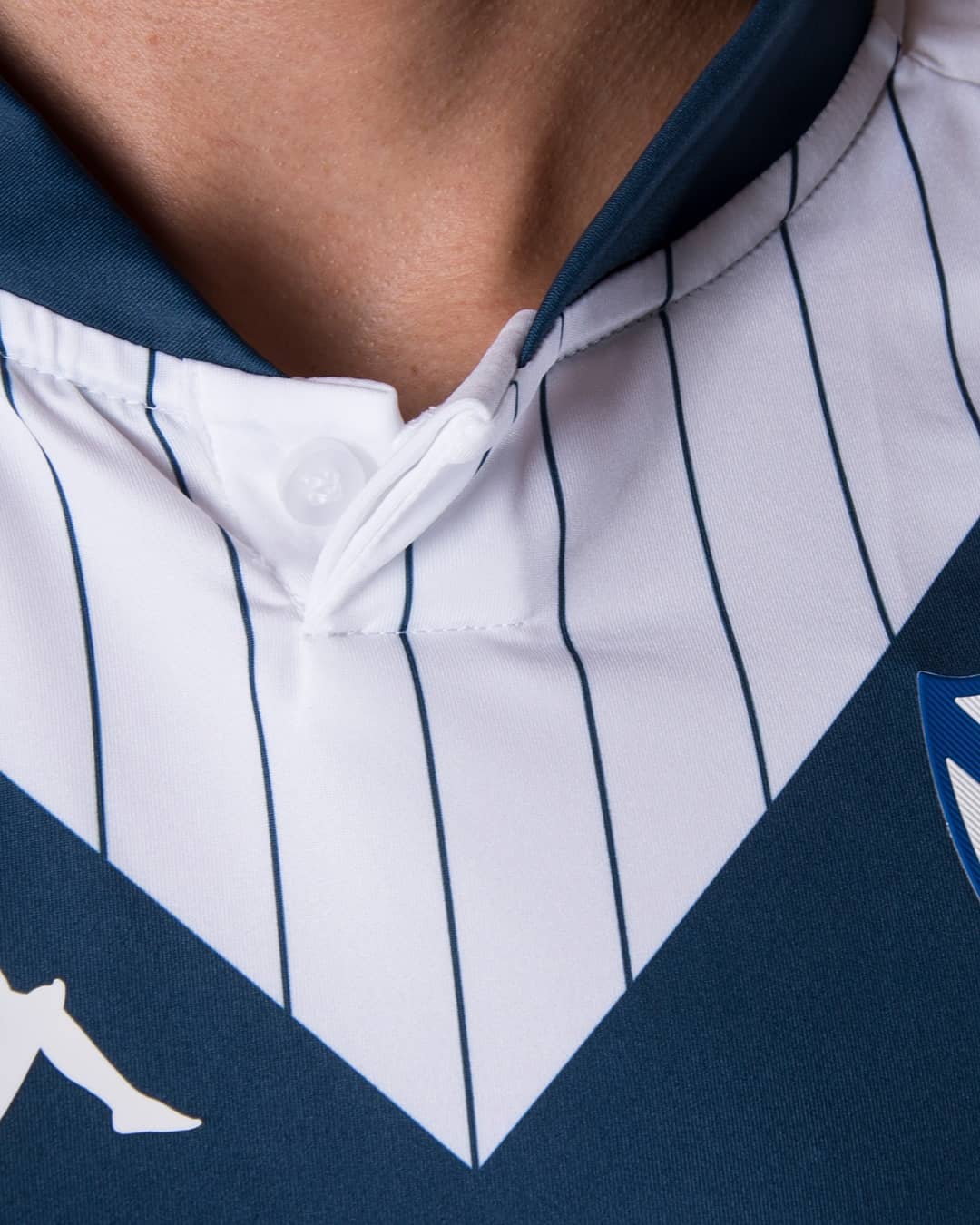 A white Kappa “Kombat Pro” design with deep blue pinstripes and the recognisable chest chevron, the new shirt has a neat contrast collar and the manufacturer’s “Omini” logo on the chest and shoulders.