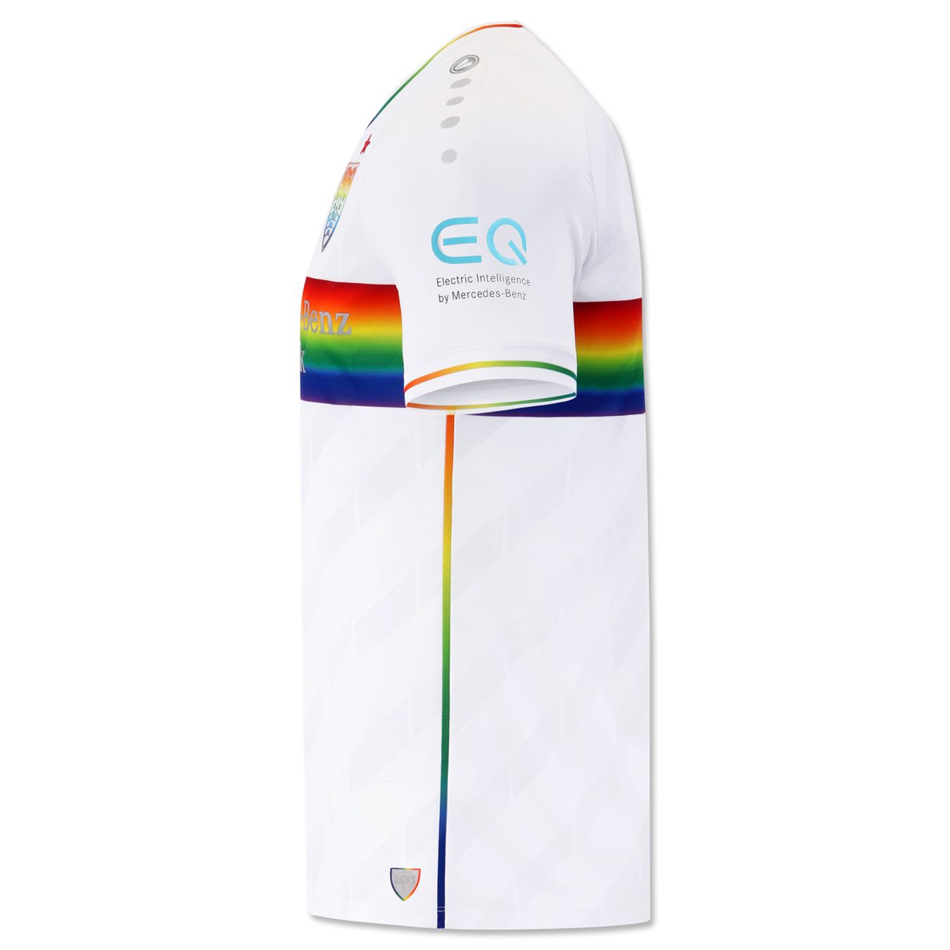 To mark “Erinnerungstag im Deutschen Fußball” (Remembrance Day in German football), the Jako design dispenses with the usual red central band and replaces it with a rainbow version to express solidarity with oppressed and persecuted LGBT+ communities since the time of the Nazis.