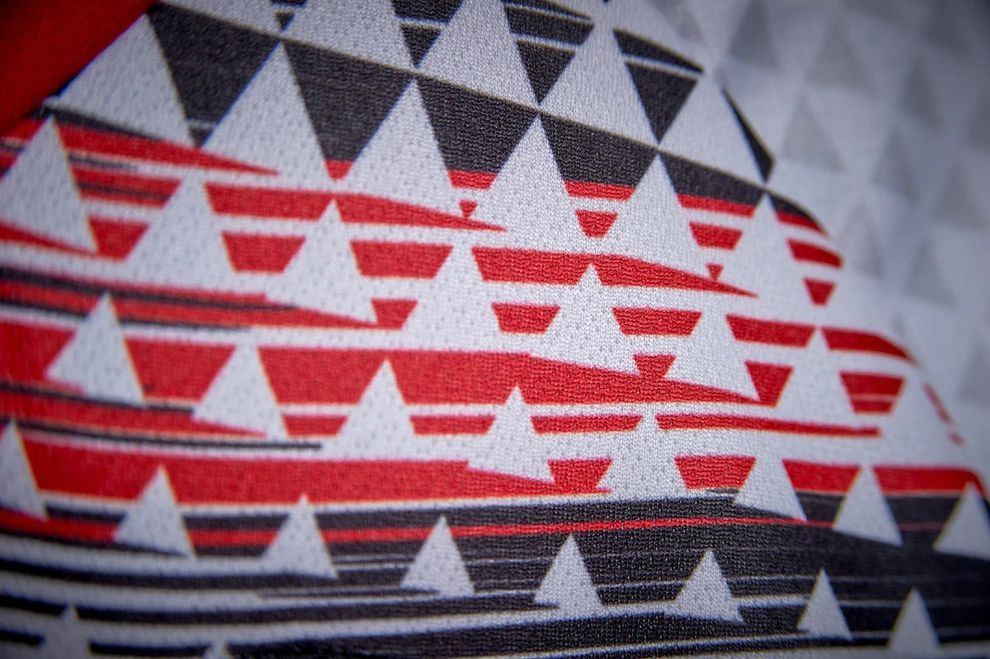 The shirt is predominantly white with a red collar and features a red and black pattern spread across the top. The shirt will feature the Black Country flag inside the neck of the shirt.