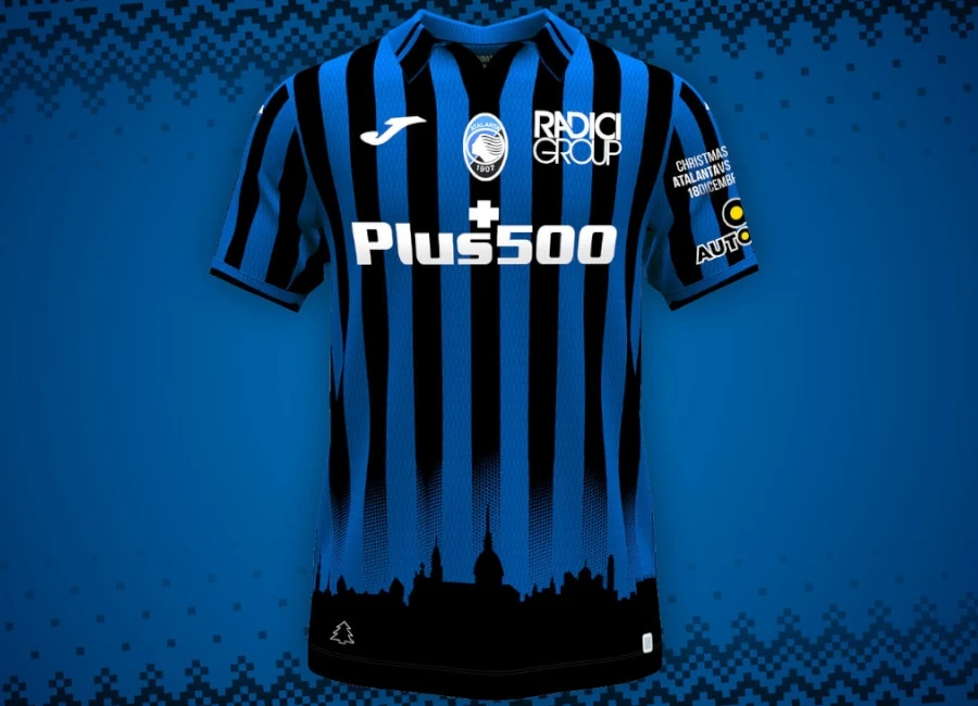 This is the new, 2021 Atalanta Bergamasca Calcio Christmas shirt. Featuring the Italian Serie A side’s famous blue and black stripes, the special release also carries a skyline print at the hem.