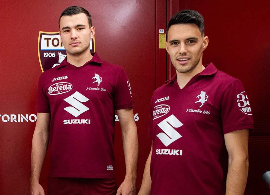 This is the Torino 115th anniversary shirt. Produced by Joma, the maroon design for the Serie A side is collared and features a simple bull crest in white with the date of establishment - “3...