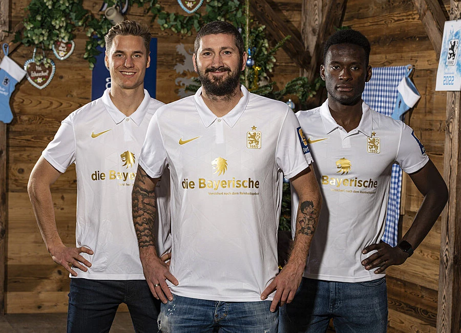 This is the new TSV 1860 München Christmas shirt. Produced by Nike, the design for the German 3. Liga side is a classic, white, collared affair with golden detailing and an embossed lion low down.