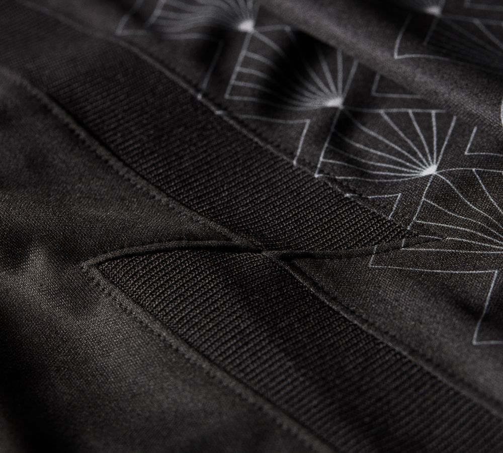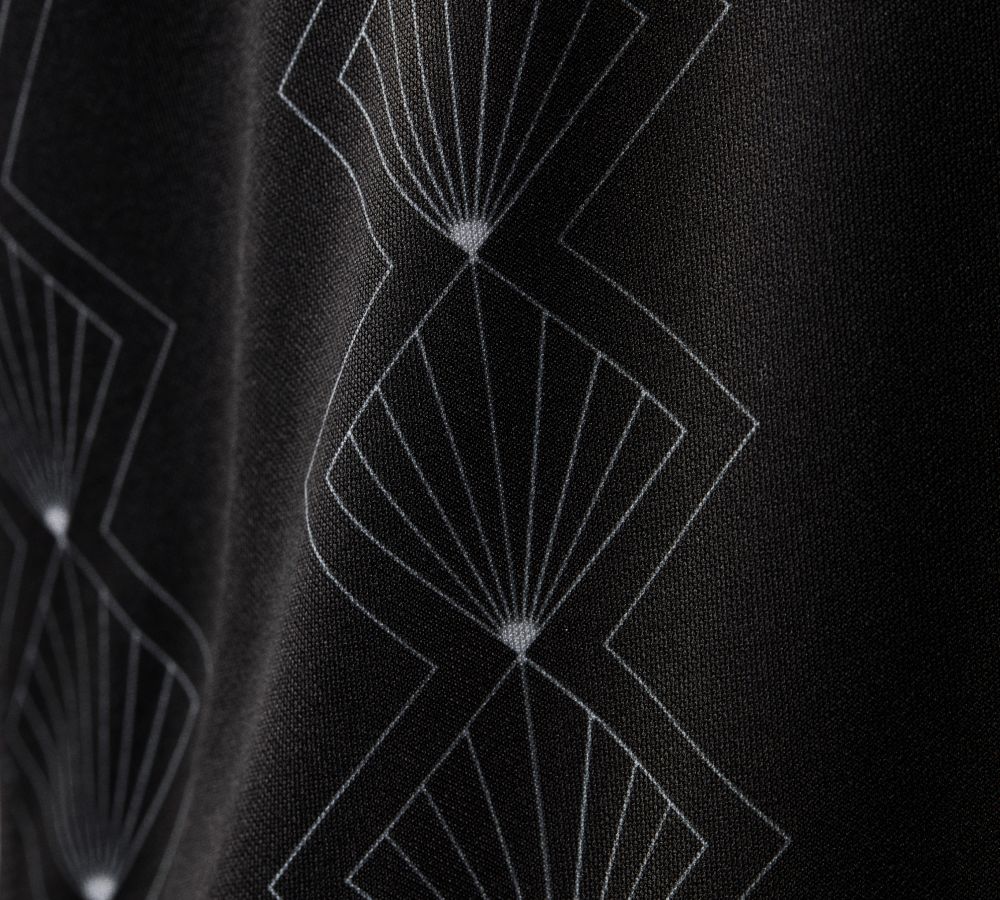 The geometric sunrise pattern evokes the first light on a dark horizon marking the start of a new day, while the zigzag pattern mirrors that of the official flag of Los Angeles.