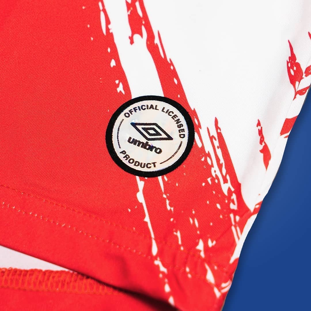 The collar and cuffs also match in contrast white, with the aforementioned sash repeated on the back, the crest in full colour and the kit completed with red shorts and socks.