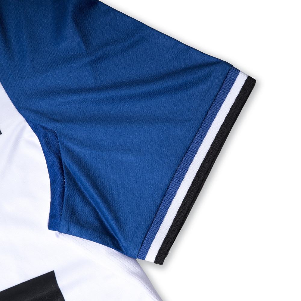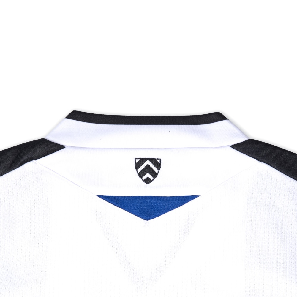 Manufactured by Macron, the new primary design consists of a white trunk embellished with three stripes on the front and back - two black and one blue - and blue sleeves.