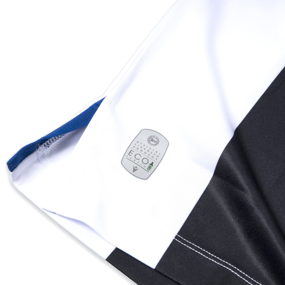 Macron “Hero” logos contrast in white and there is a coat of arms detail on the upper back of a shirt made from recycled plastic bottles and to be worn with black shorts and socks as first choice.