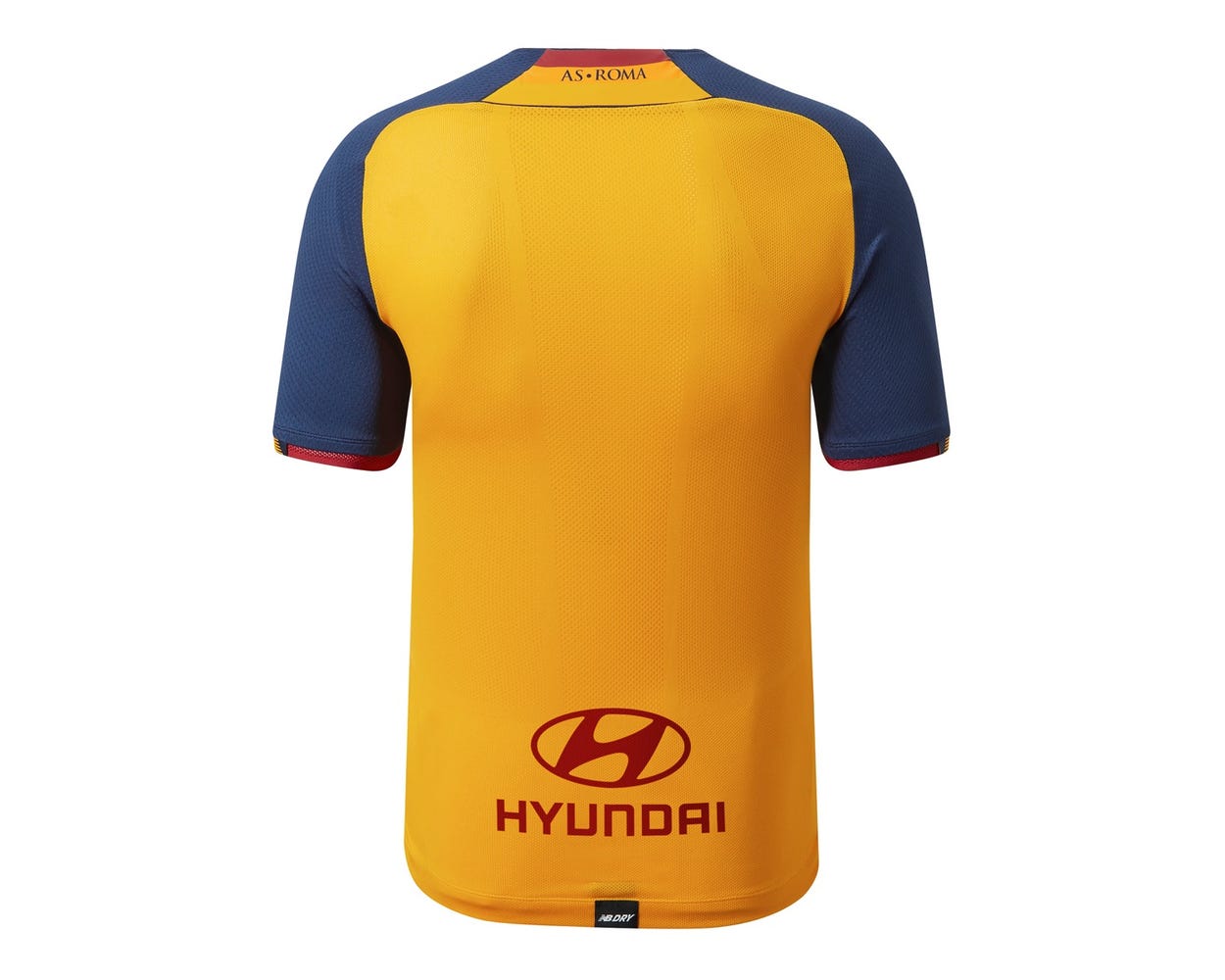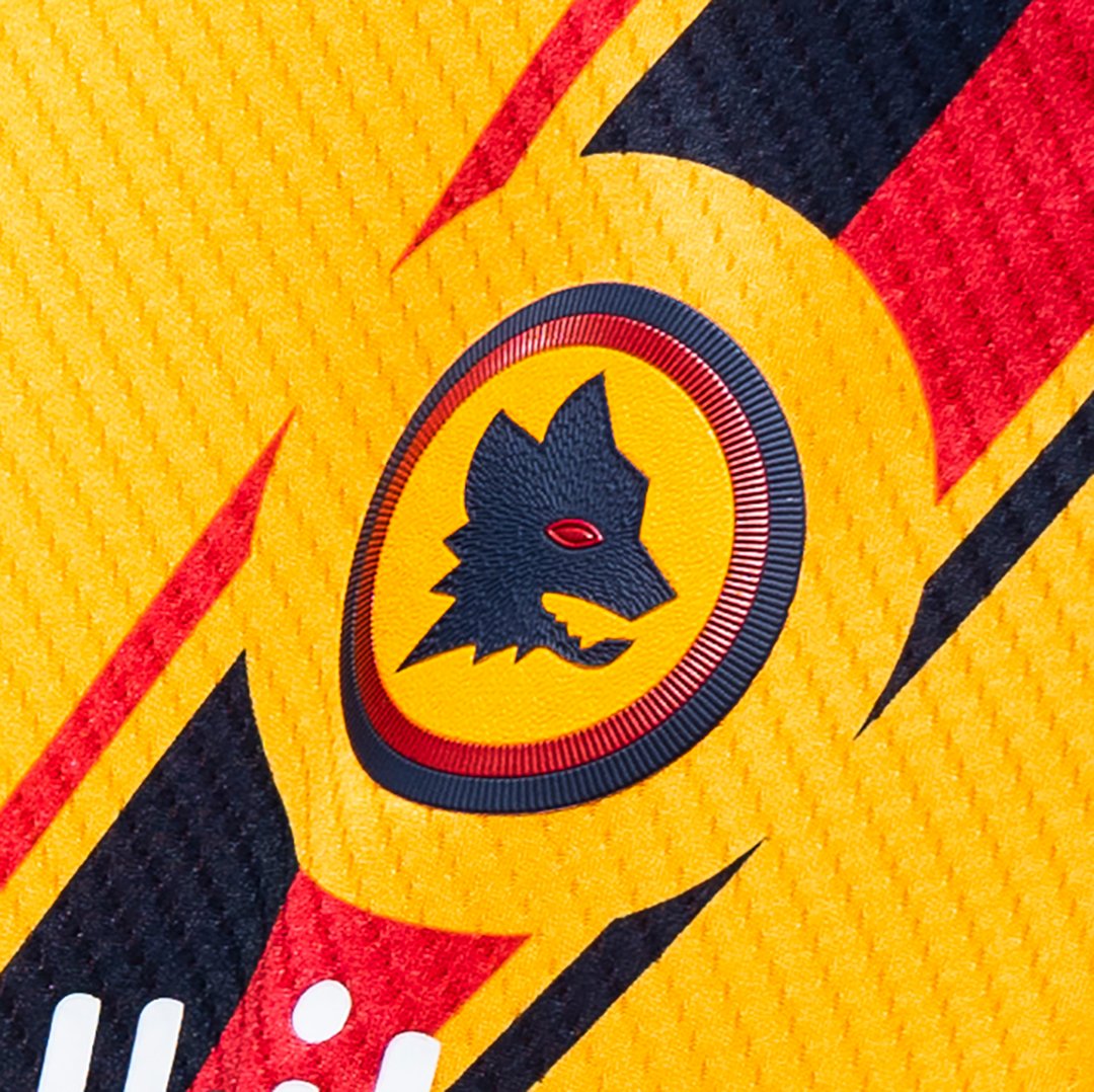 The main body of the kit is introduced in a striking Gold which is synonymous with the Giallorossi. A striking Navy and a Rich Red sash flows diagonally from the shoulder, framing the crest, and runs into the hem of the jersey.