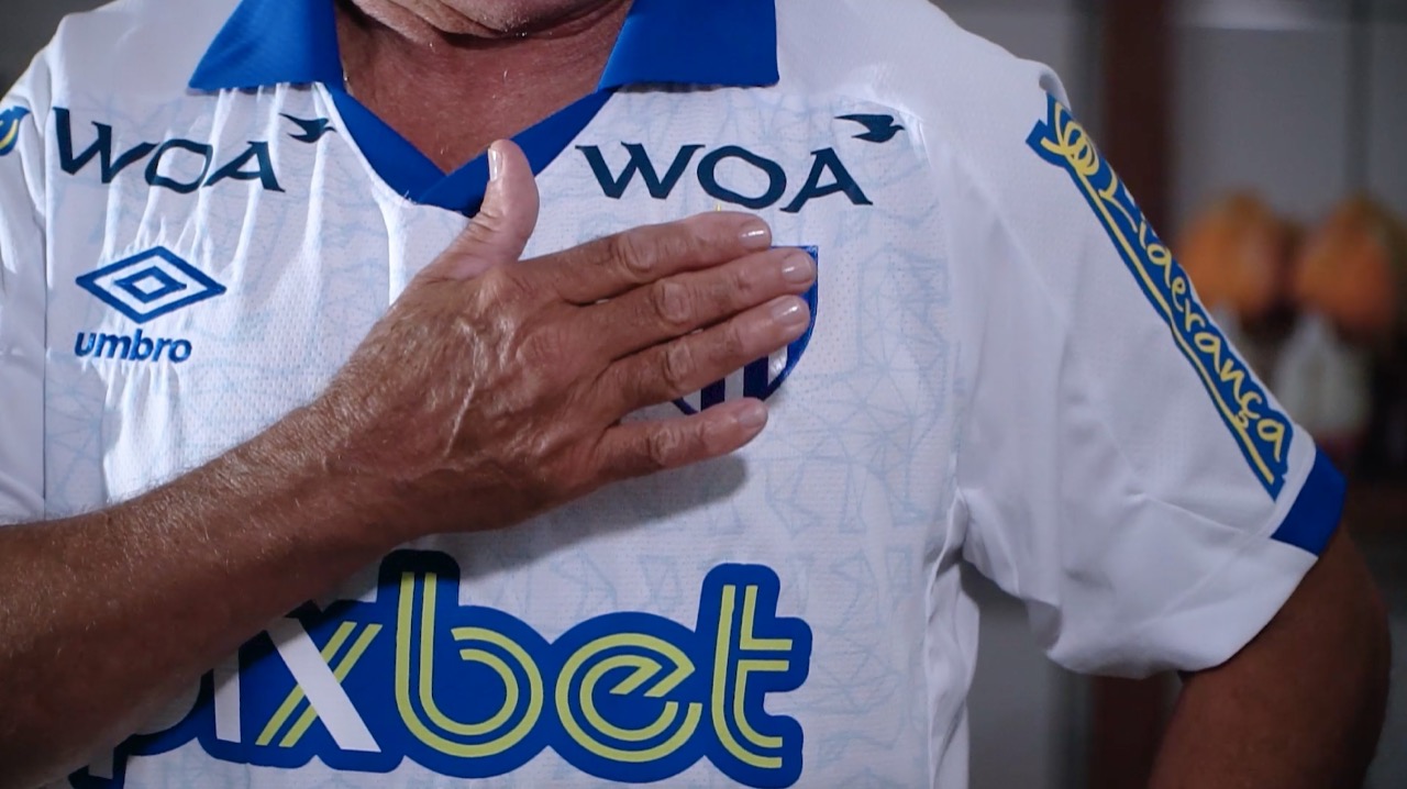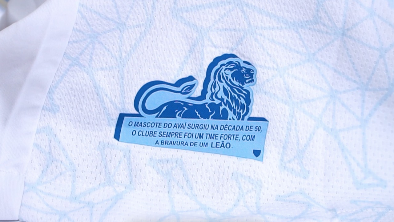 Focussed on the “Leão da Ilha” (lion of the island) club mascot, the shirt features a repeated, wireframe-style depiction of the big cat in blue on the white base.