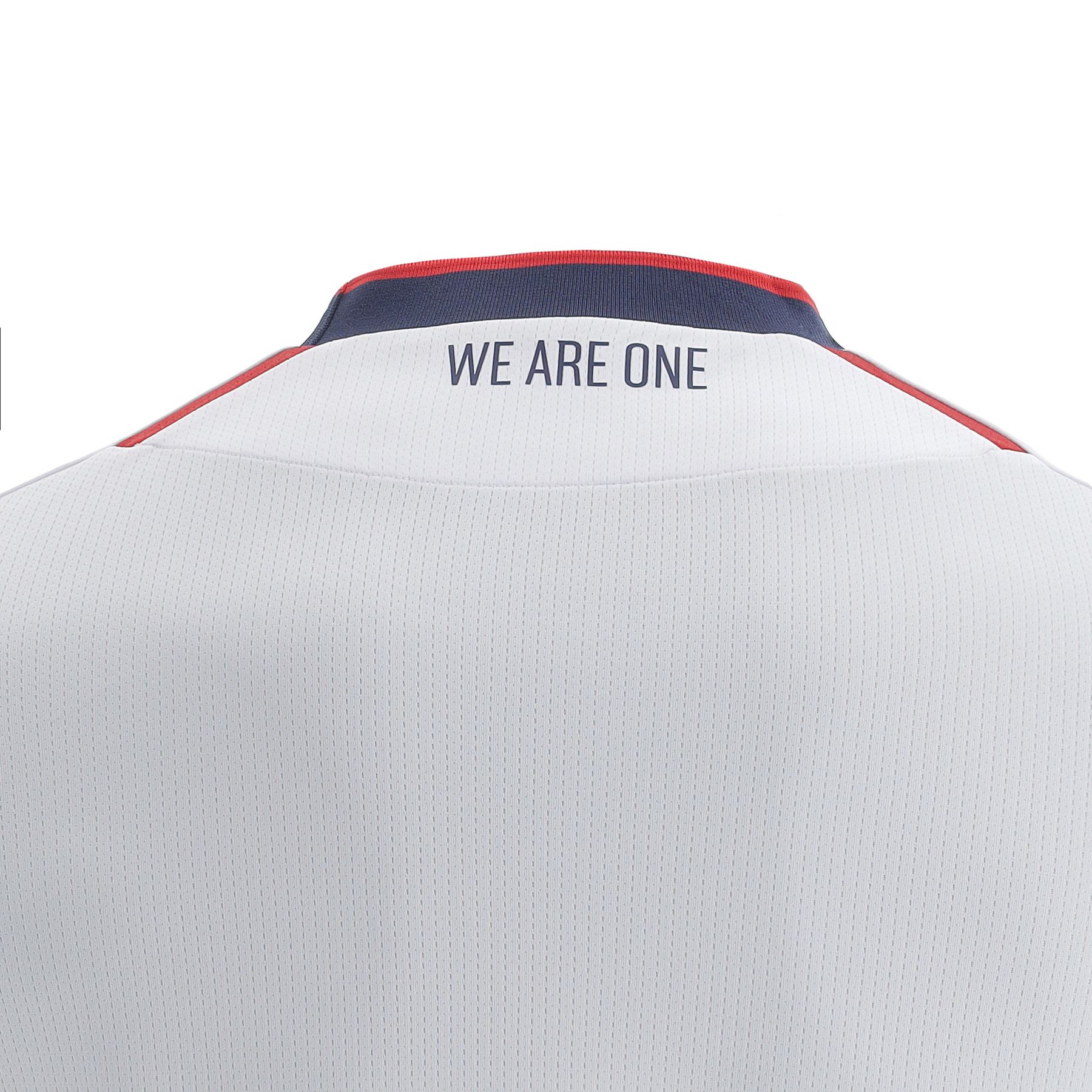 The Away version is white. This version of the crew neck knit jersey has a thin red stripe accent that is repeated on the sleeve hems.
