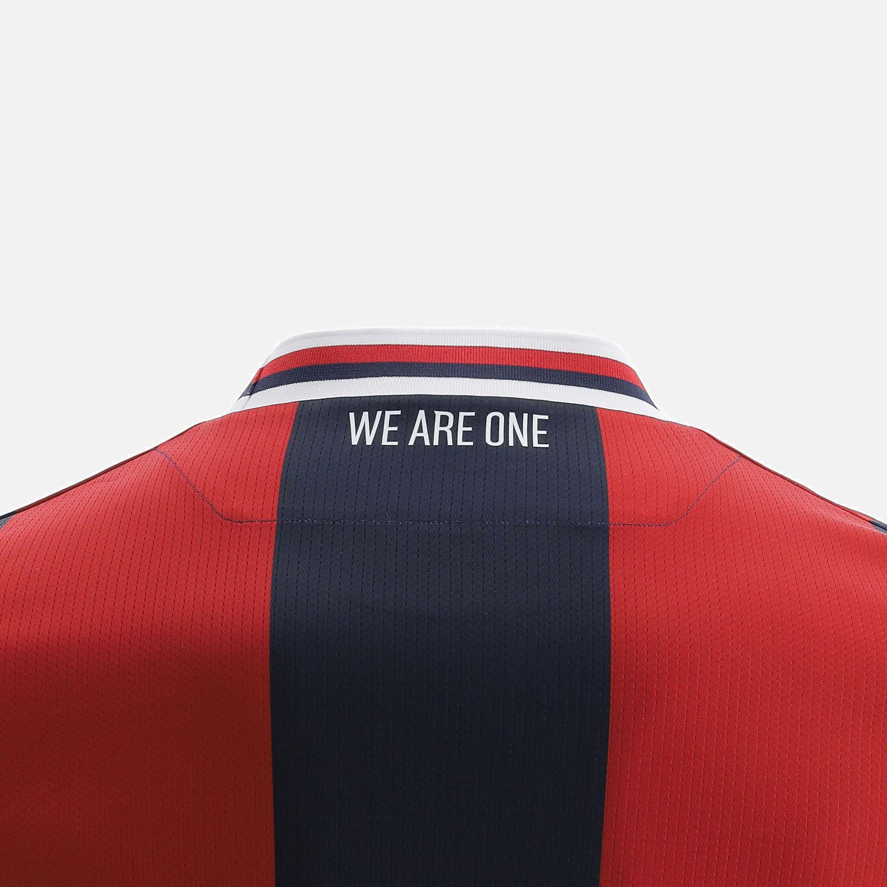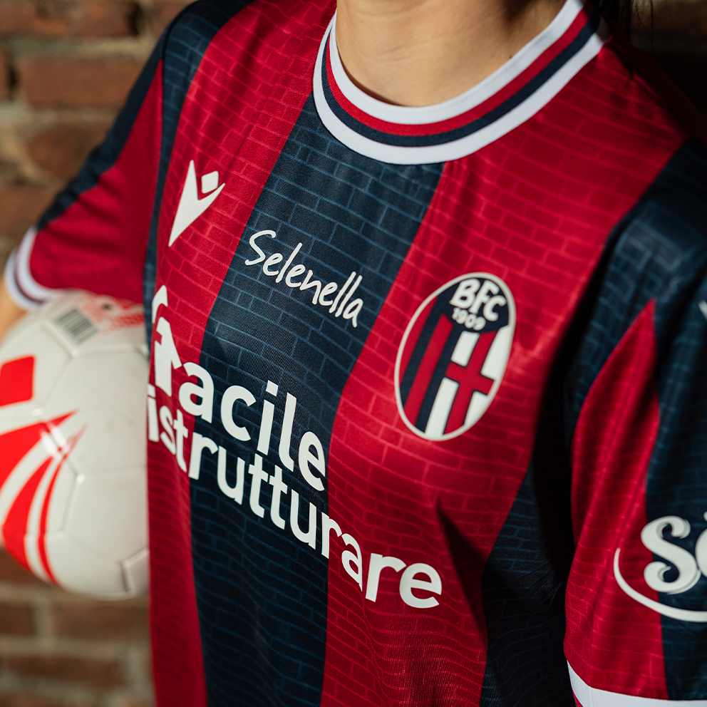 The Italian brand’s Macron Hero logo is printed in silicon in white on the right breast and the Bologna FC 1909 badge is on the left, close to the heart.
