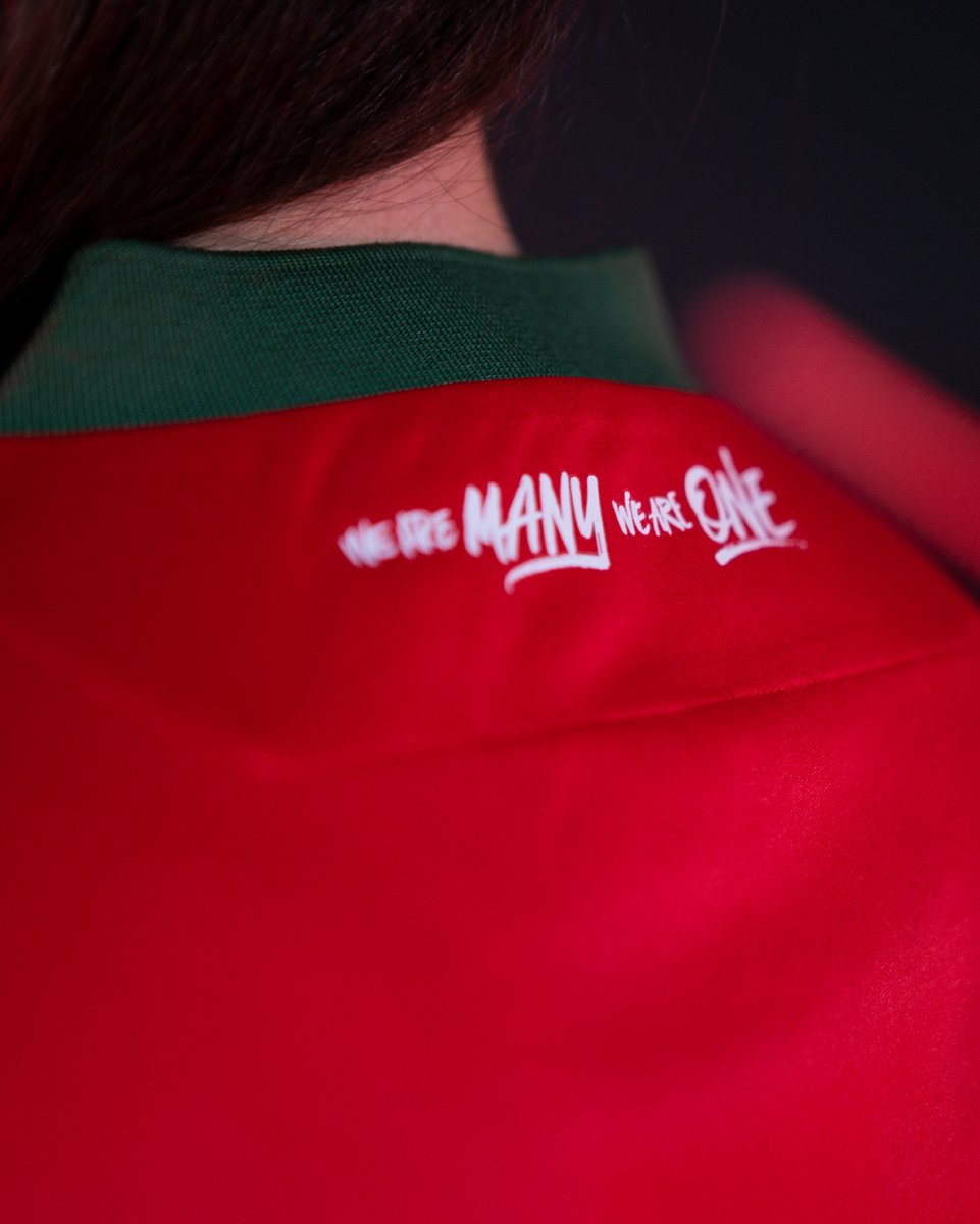 The Macron 2021 predominantly red jersey incorporates pops of white and Regimental Green in the collar and sleeves.