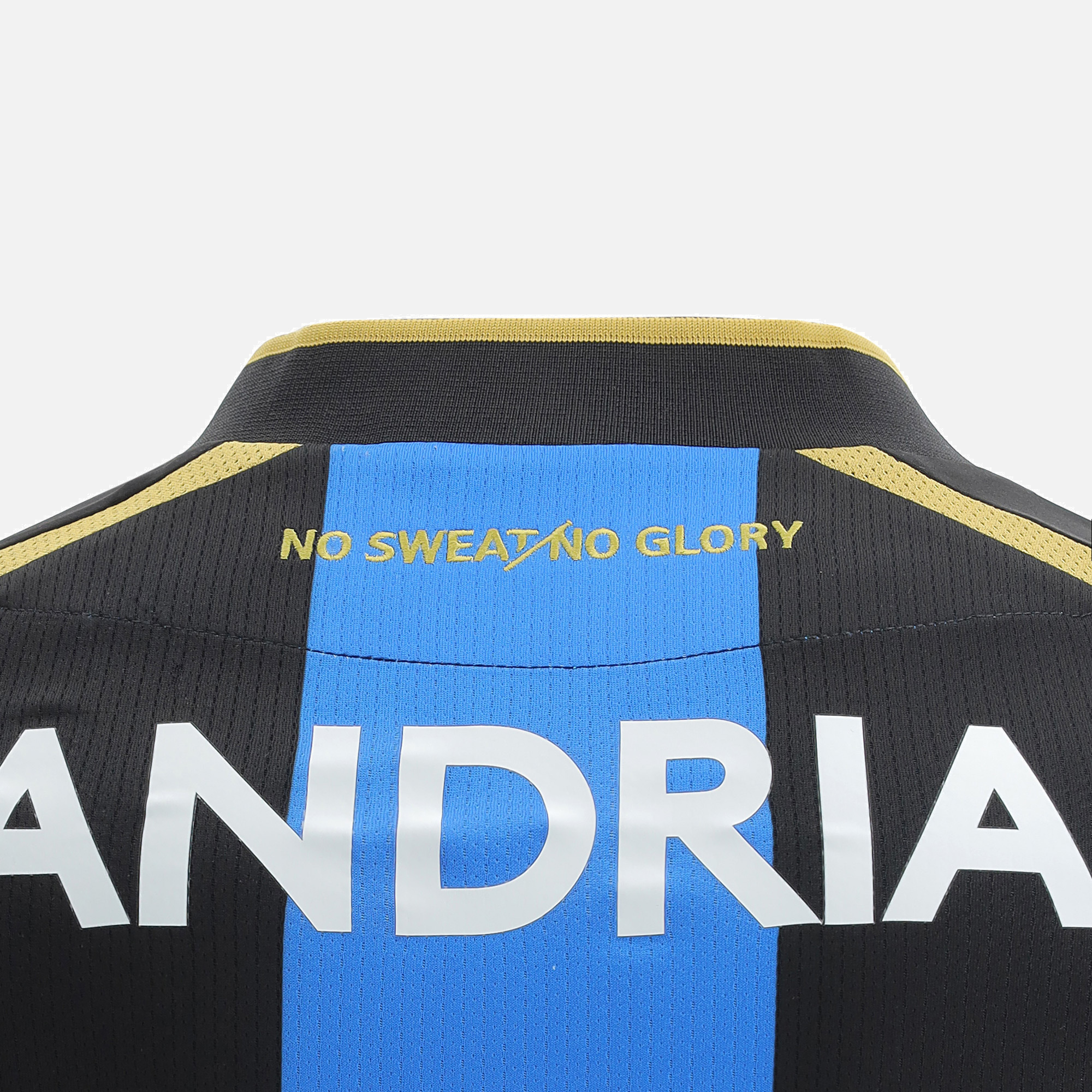 Embroidered on the back neck is the club's motto "NO SWEAT, NO GLORY”, which is also the commitment that every player makes when proudly wearing the team’s black and blue colours. The shorts are black with gold detailing, like the socks, with the Macron Hero logo on the front. The letters FCB, standing for Football Club Brugeois, are printed across the calf. The Slim Fit jersey is mainly made of Softlock fabric with micromesh inserts to improve the breathability of the garment.