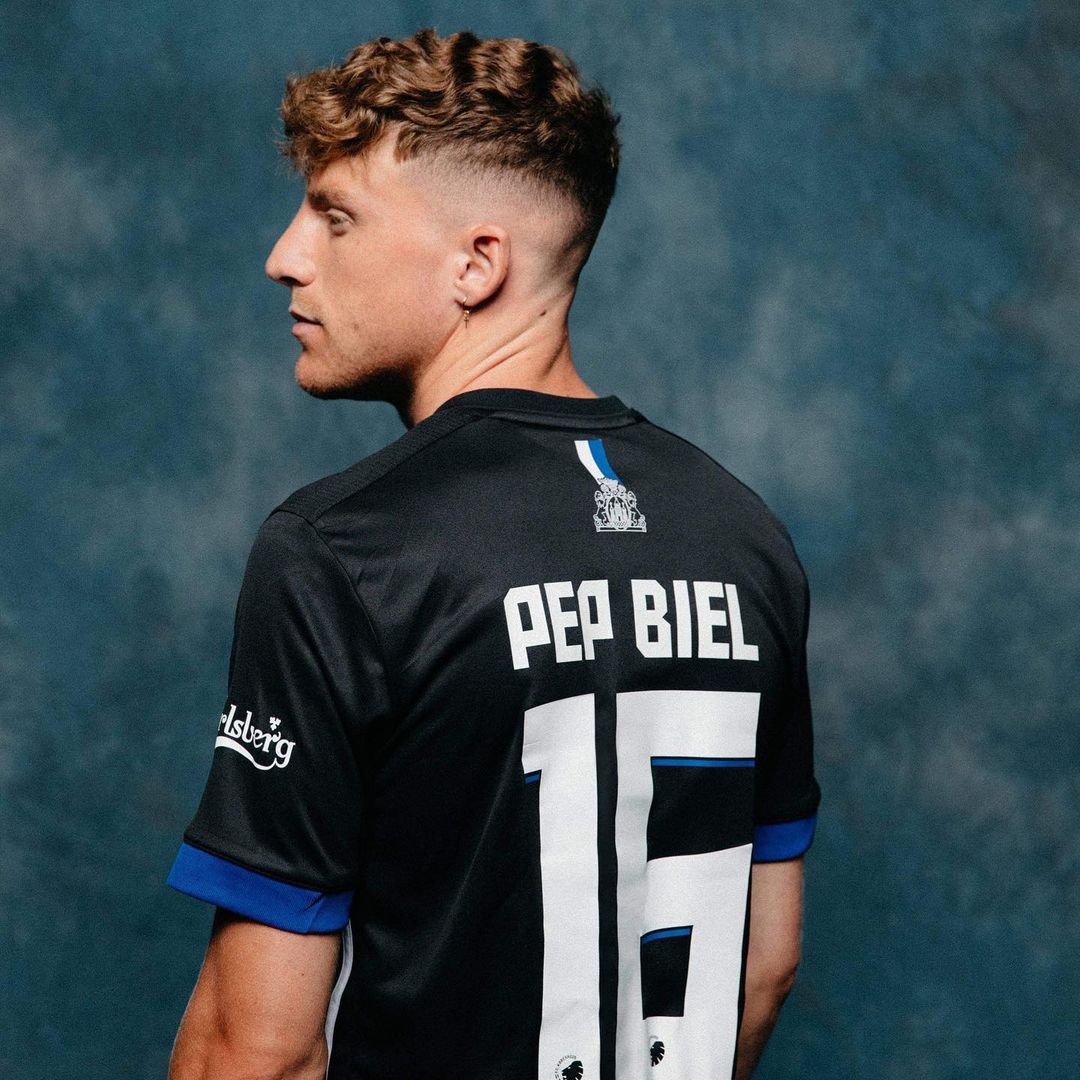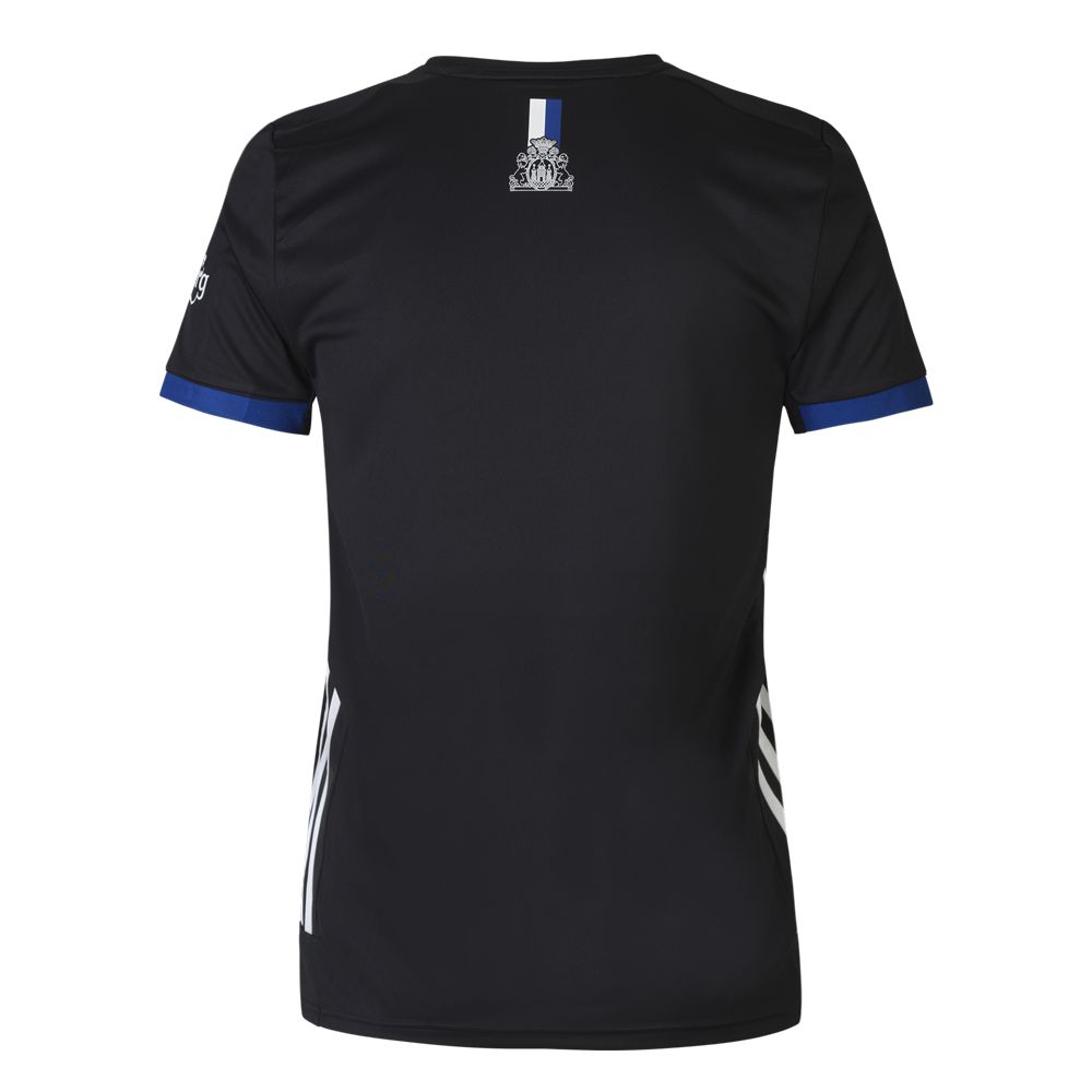 The adidas side-of-trunk striping is in blue on the Home shirt, which forms a nominally one-coloured kit with white shorts and socks, while most embellishment, including adidas’s branding, is in white on the black Away, with blue providing minimal further accents.