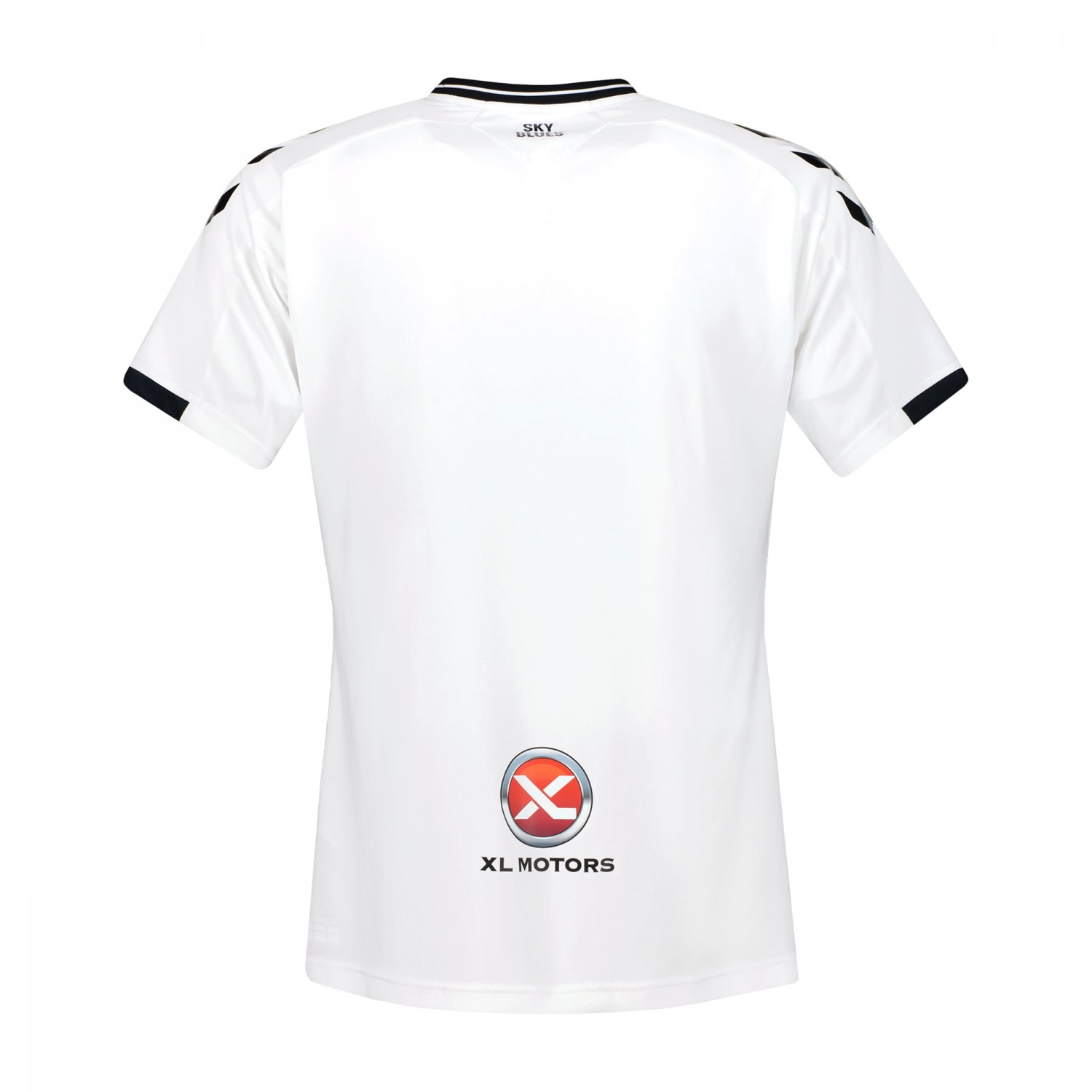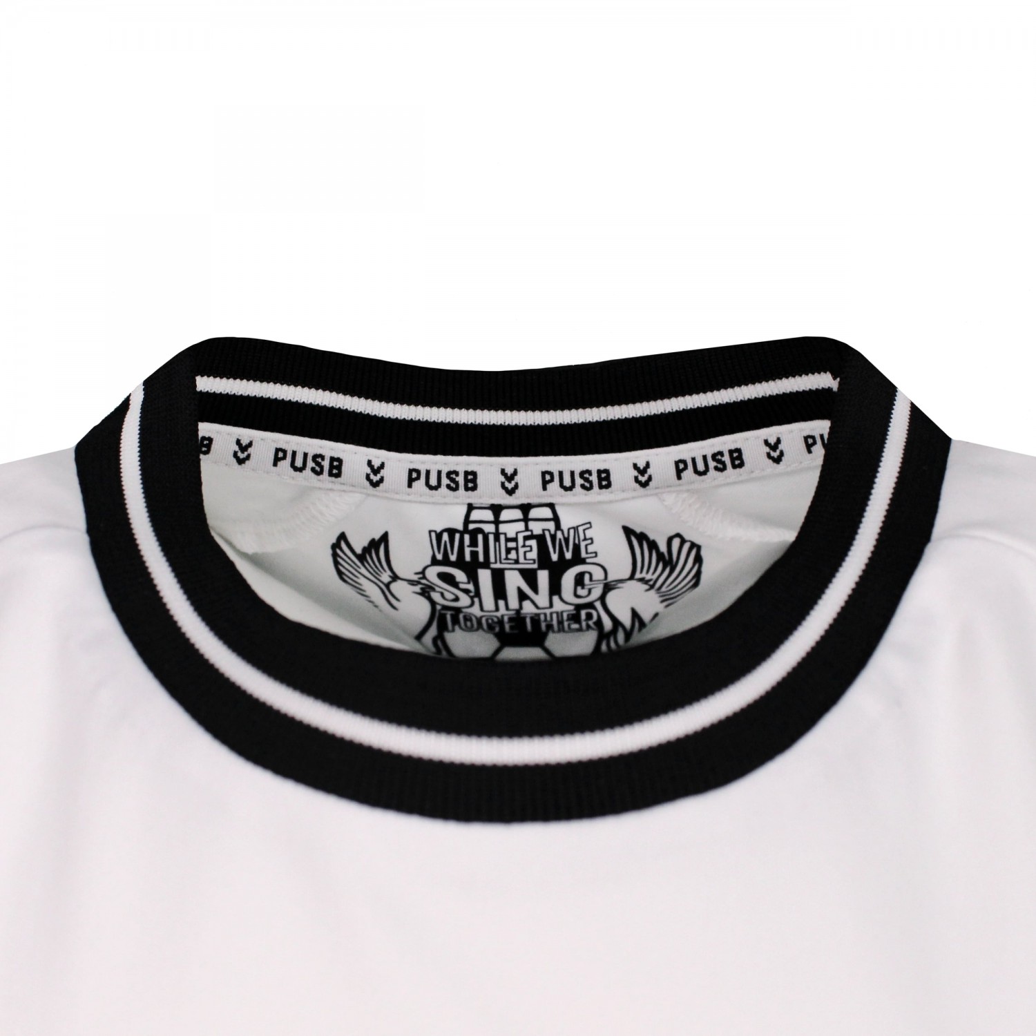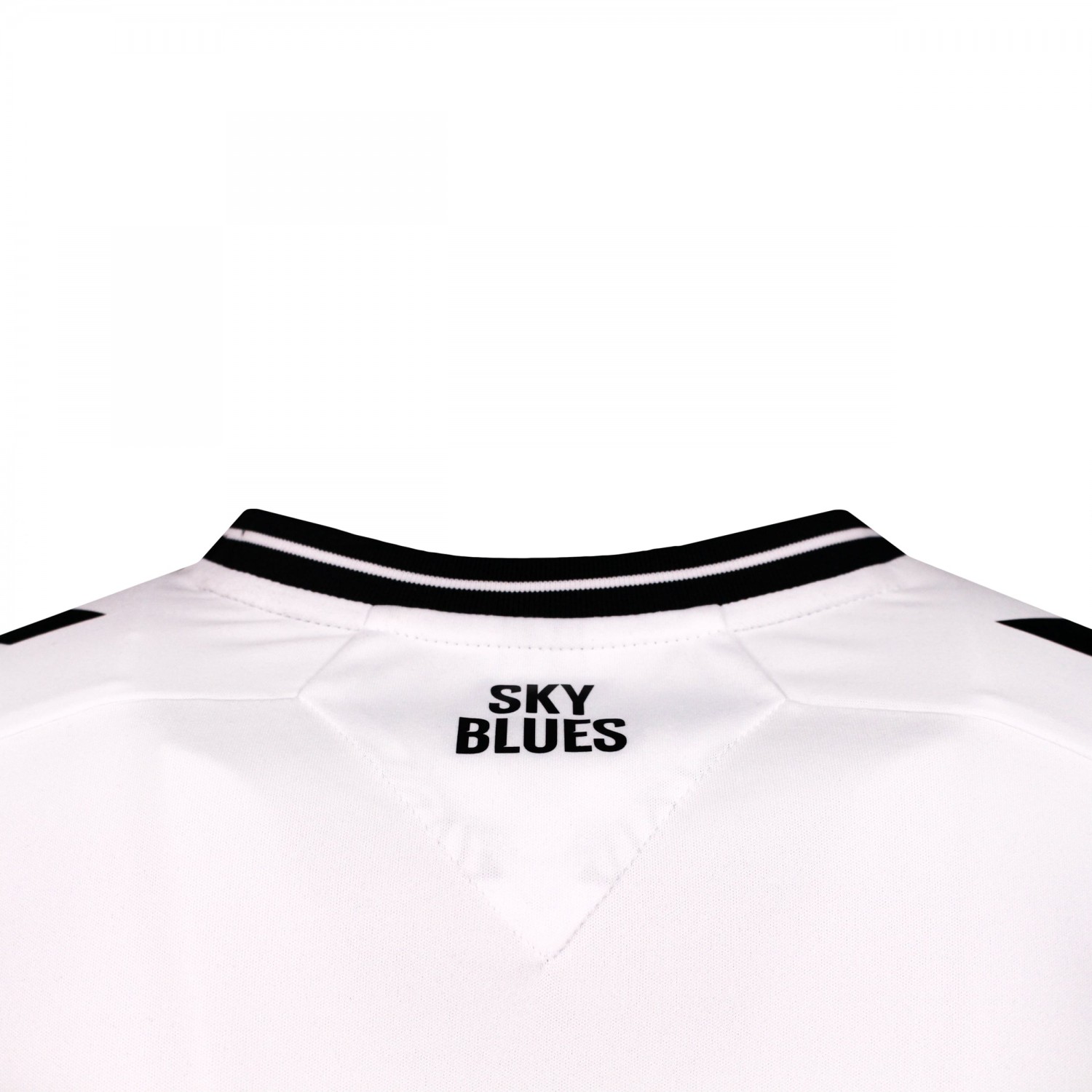 The Hummel shoulder chevrons are black, while the black and white monotone Coventry City crest is on the chest alongside the Hummel logo. Meanwhile, ‘Sky Blues’ is on the rear of the shirt and the words ‘While We Sing Together’ are shown on the in the inside of the shirt.